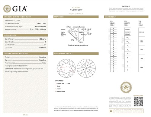 a GIA report numbered 7536123809 dated 1 September 2025 stating that the 1.50 carat diamond is natural, E colour, SI1 clarity.