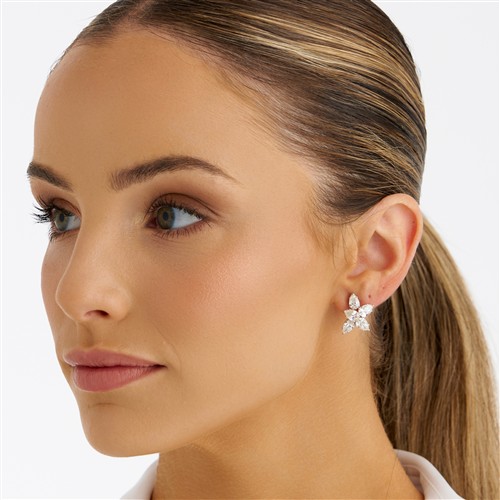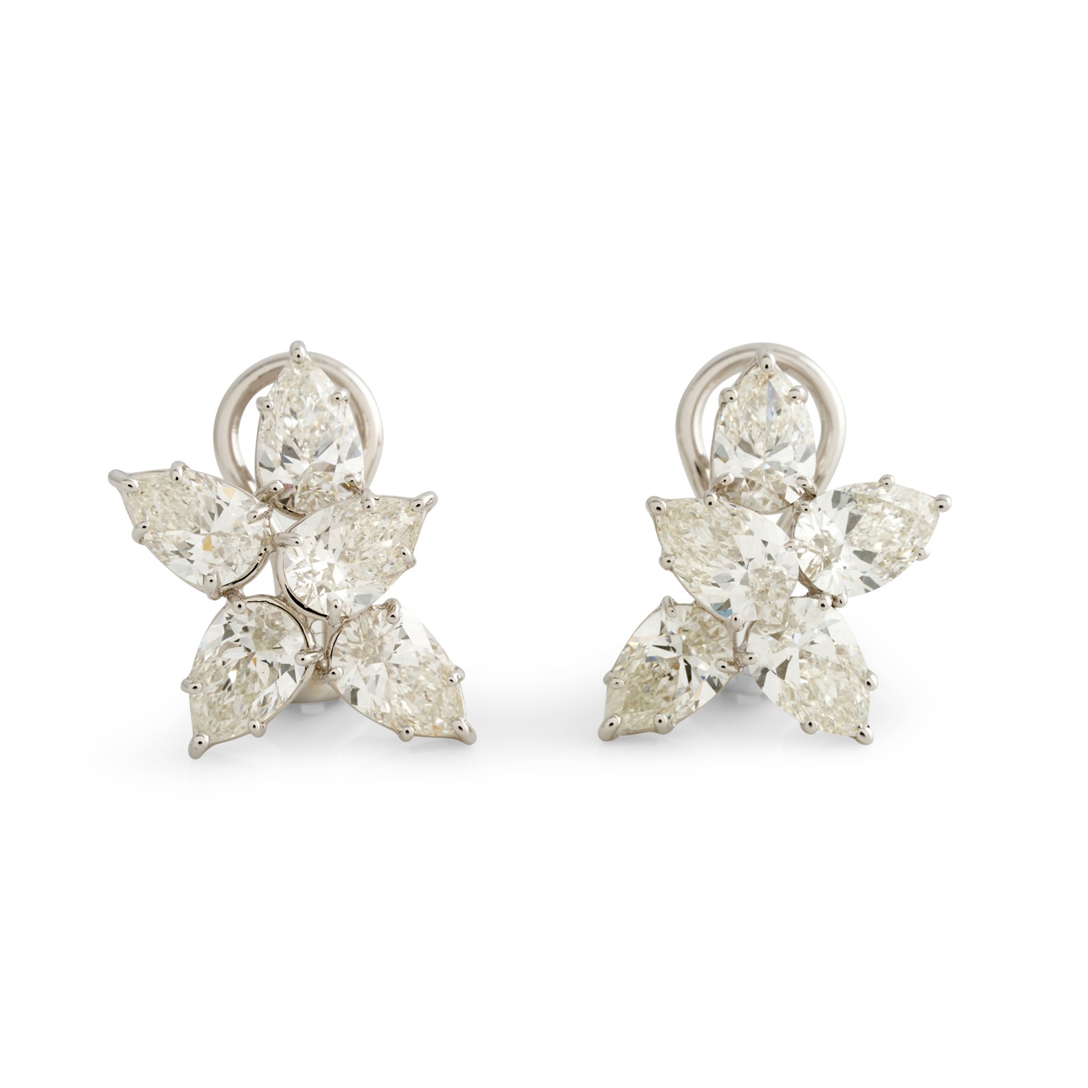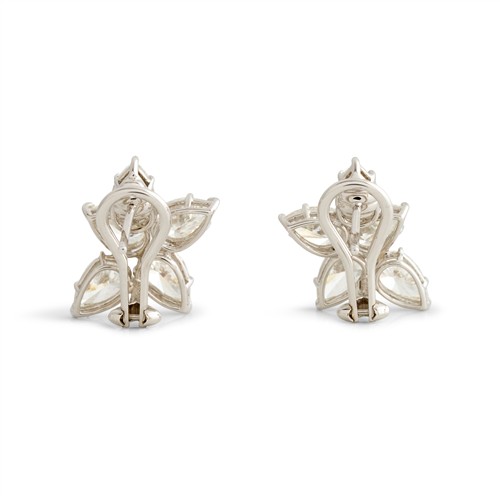 Each of cluster design, claw-set with five pear brilliant-cut diamonds, the diamonds together weighing approximately 5.88 carats, mounted in 18ct white gold, length 20mm, post and clip fittings, gross weight approximately 6.0 grams.