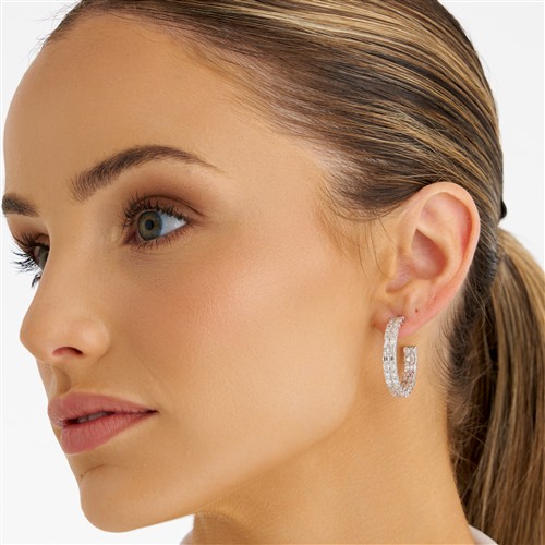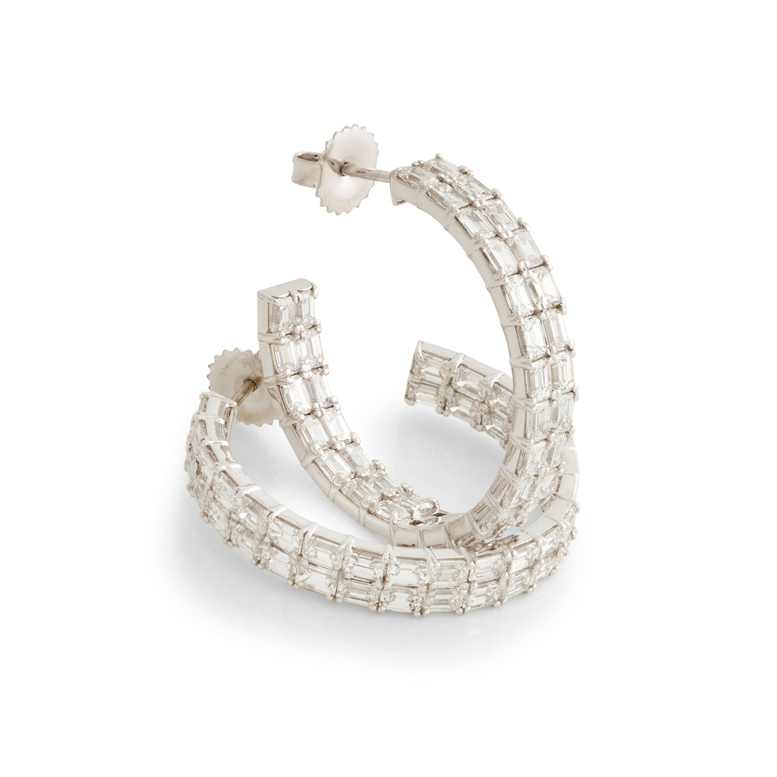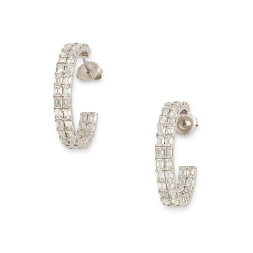 Each elliptical hoop is claw-set with emerald-cut diamonds to the front and inside back, the diamonds together weighing approximately 7.33 carats, mounted in 18ct white gold, post and scroll fittings, length 29mm, width 27mm, gross weight approximately 11.6 grams.