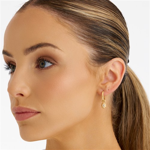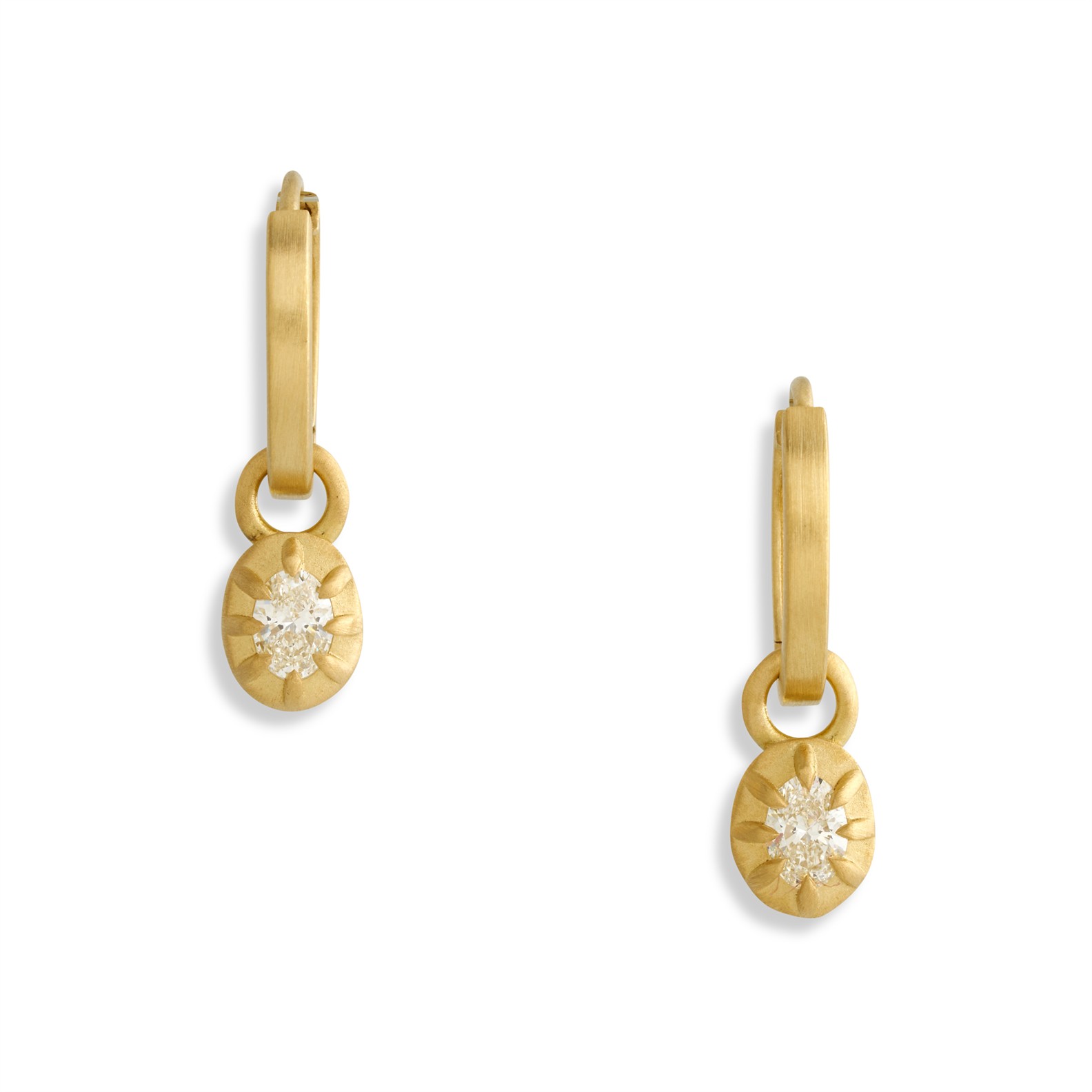 Each centring a claw and collet-set oval brilliant-cut diamond weighing 0.32 carats and 0.30 carats respectively, mounted in satin finished 18ct gold, post and lever-back fittings, length 24mm, gross weight approximately 4.4 grams.
