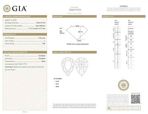 Accompanied by a GIA report (gia.edu/report-check-landing) numbered 1533111773, dated 13 August 2025, stating that the 1.70 carat diamond is natural, L colour, VS2 clarity.
