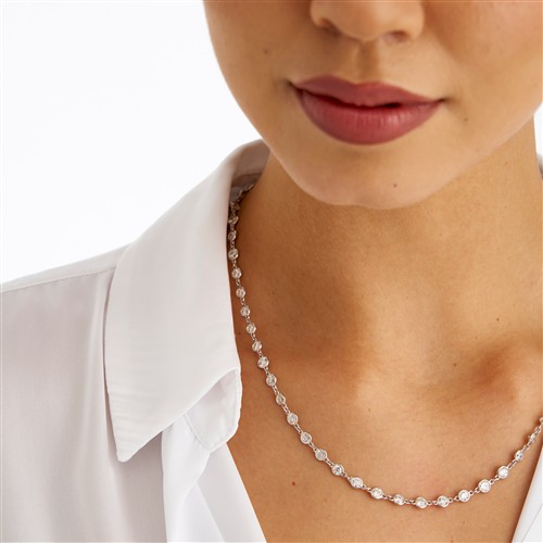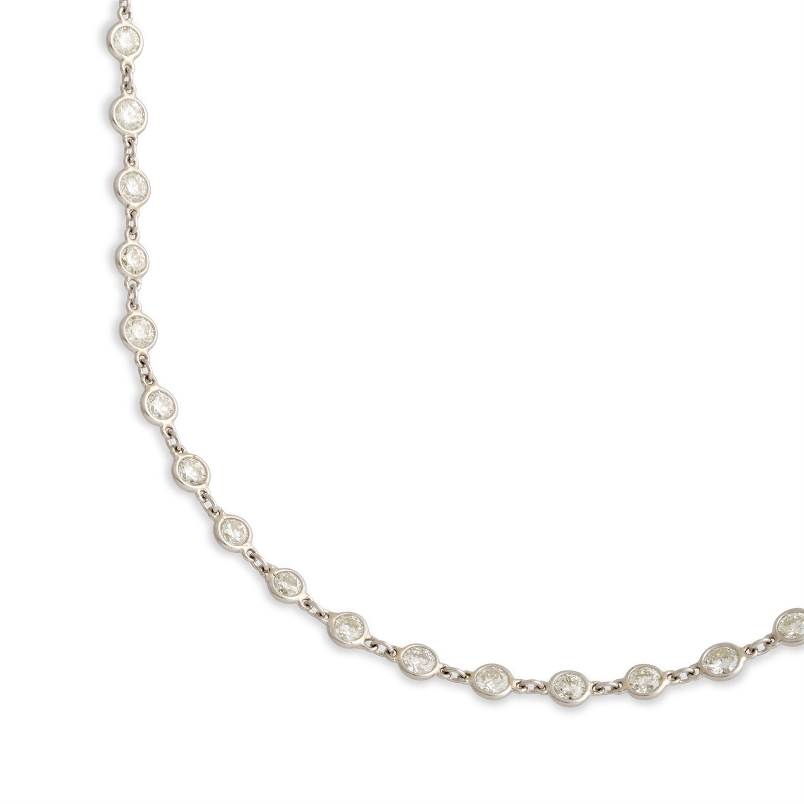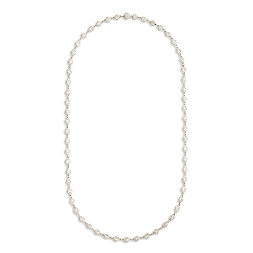Designed as a continuous line of 58 spectacle-set brilliant-cut diamonds alternating between trace link connectors, the diamonds together weighing 9.00 carats, mounted in platinum, inner circumference 465mm, gross weight 12.3 grams.