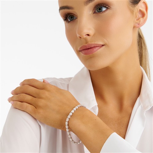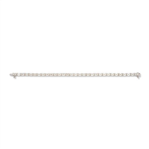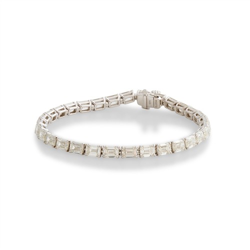 Composed as a line of 31 claw-set emerald-cut diamonds completed by a concealed box clasp, the diamonds together weighing 15.61 carats, mounted in 18ct white gold, length 180mm, gross weight approximately 14.3 grams.