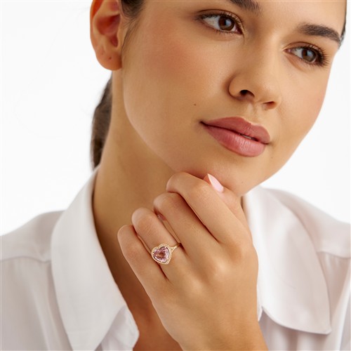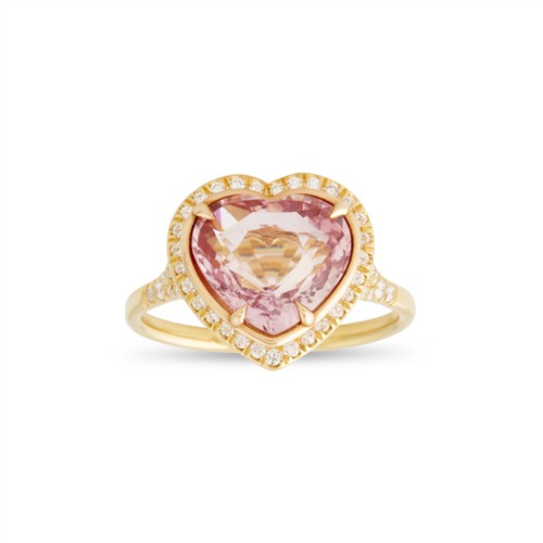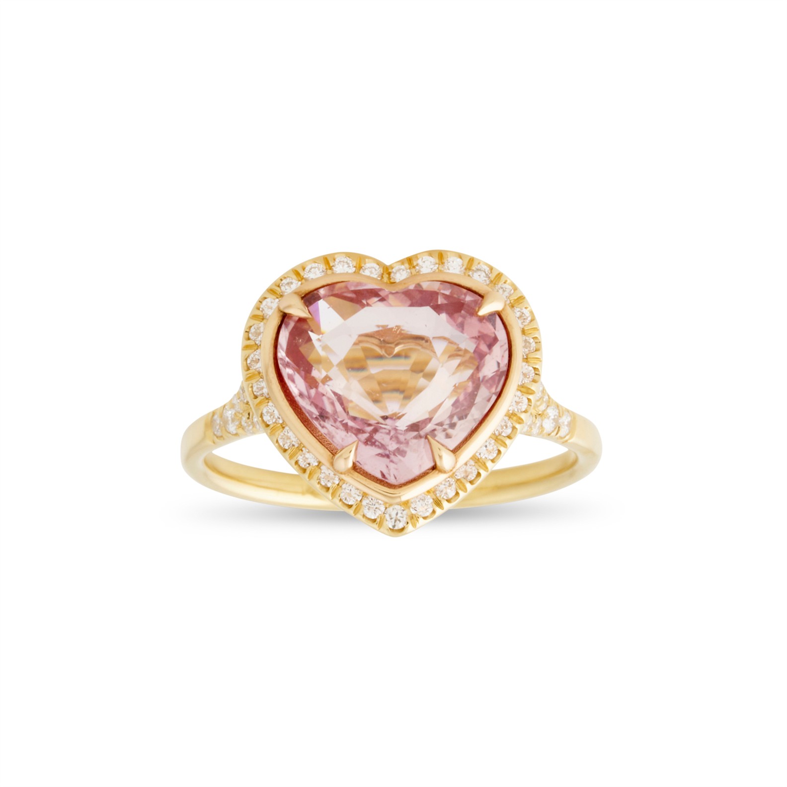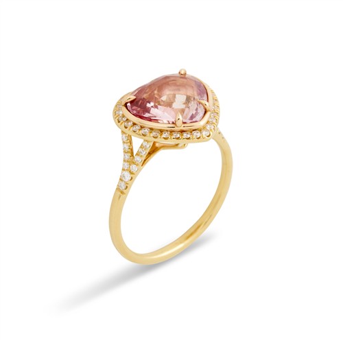 Of cluster design, centring a claw-set heart-shaped orange-pink padparadscha sapphire weighing approximately 3.52 carats, framed by a halo of pavé-set brilliant-cut diamonds to similarly set split shoulders, the diamonds together weighing approximately 0.30 carats, mounted in 18ct gold, size M, gross weight approximately 4.7 grams.