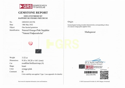 Accompanied by a Gem Research Swisslab report numbered GRS2022-041596 dated 18 May 2022 stating that the 3.52 Padparadscha sapphire is natural, of Madagascan origin.
