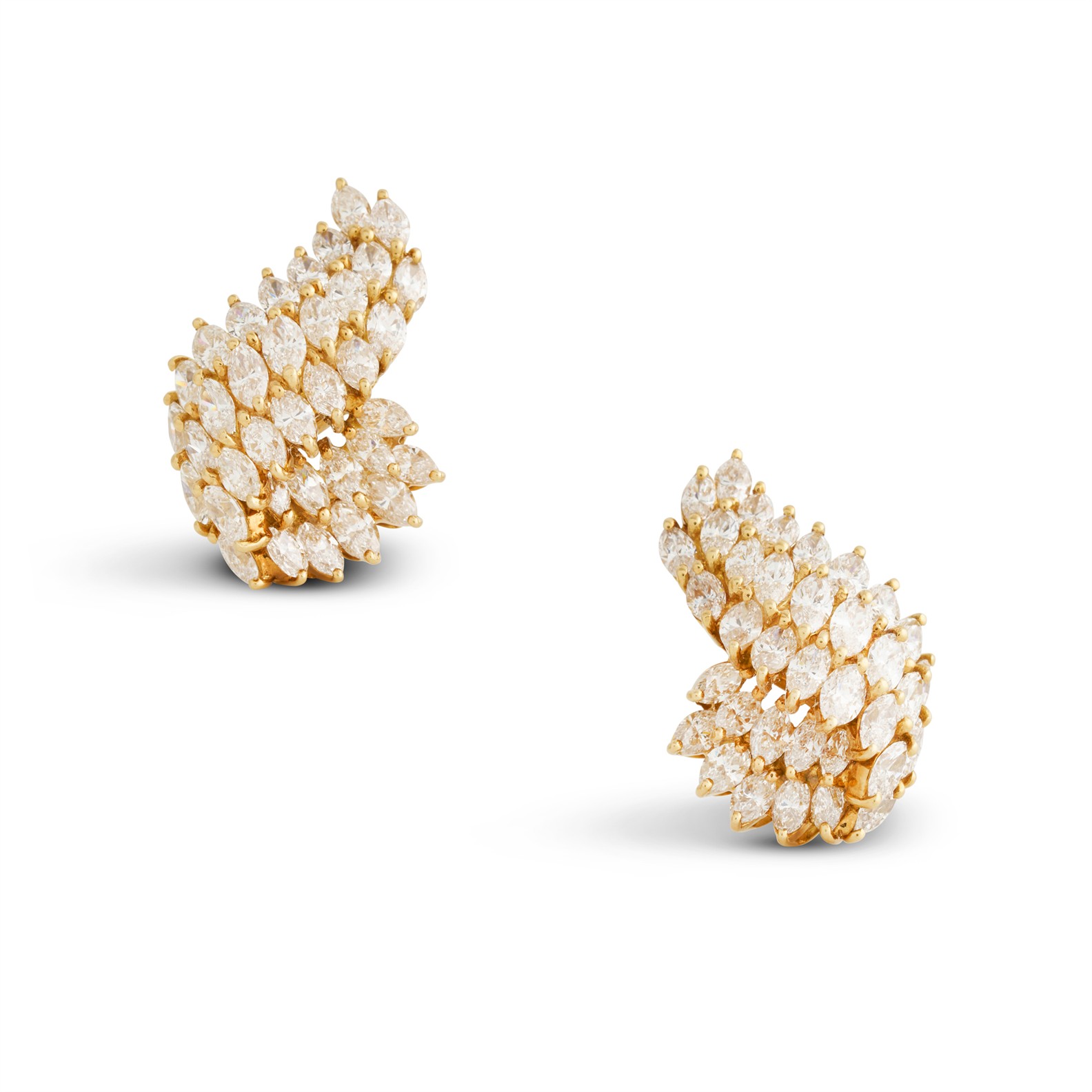 Each of stylised ribbon design, claw-set to the front with marquise-cut diamonds, the diamonds together weighing approximately 7.00 carats, mounted in 18ct gold, length 26mm clip fittings, gross weight approximately 18.8 grams, signed T&Co. Italy.