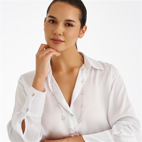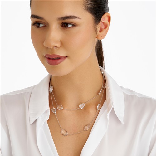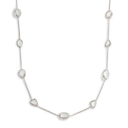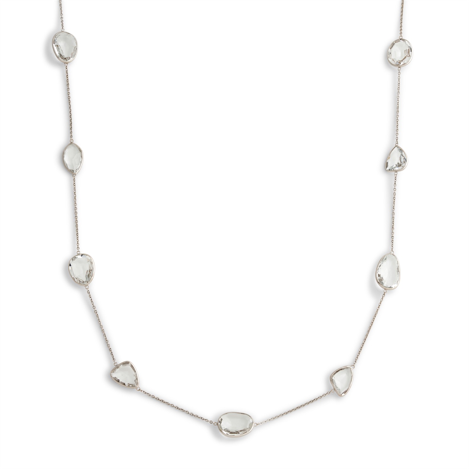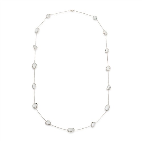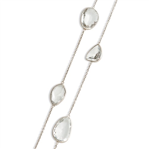 Designed as a line of spectacle-set multi-shaped white topaz, set at intervals between trace chain connectors, mounted in 18ct white gold, inner circumference 840mm, gross weight approximately 21.1 grams.