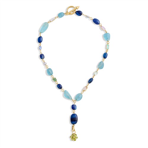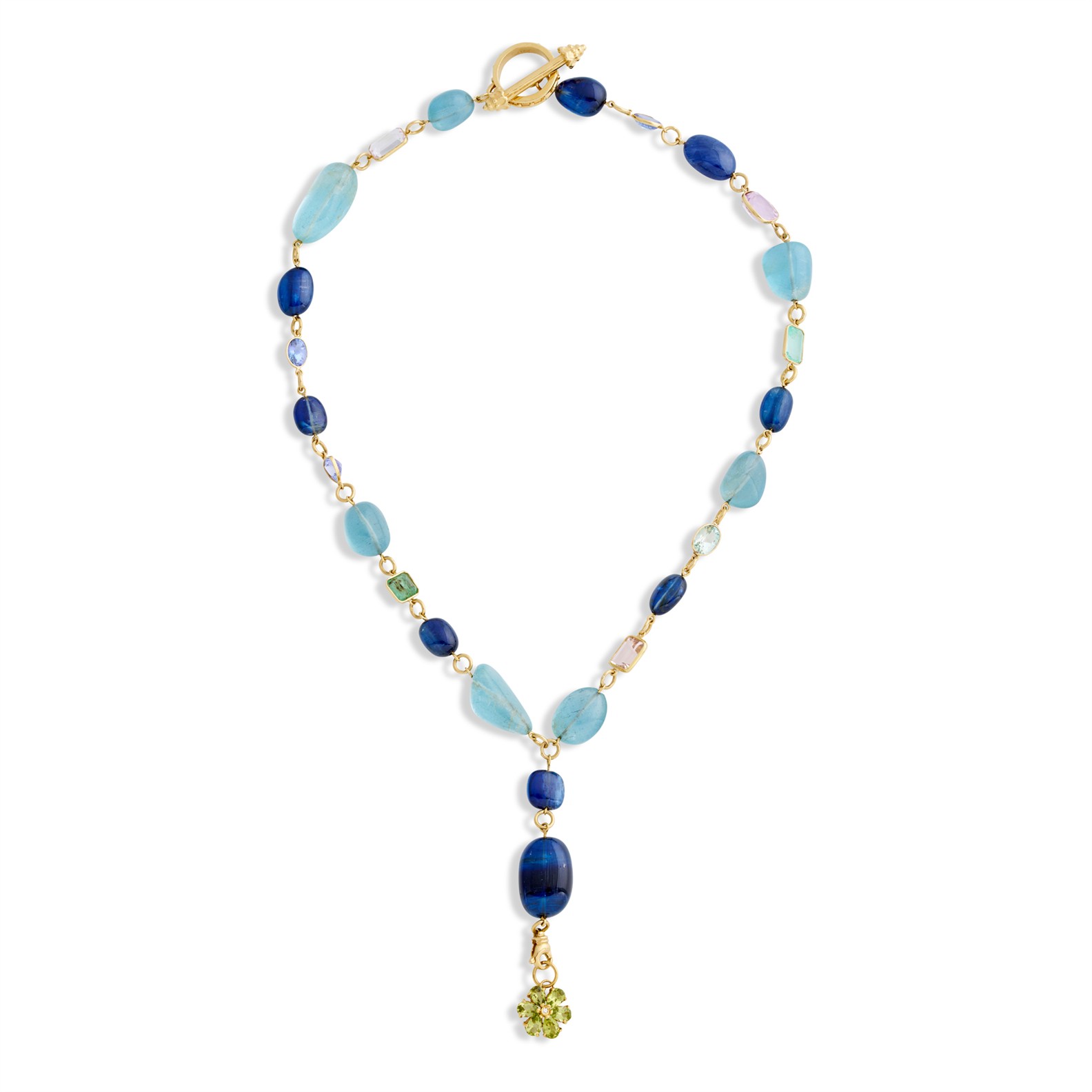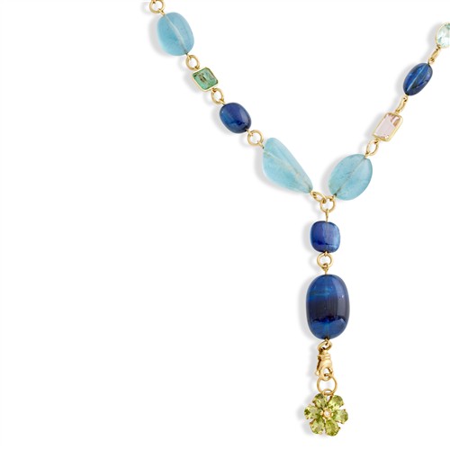Terminating in a detachable flower charm set with pear-shaped peridots, surmounted by an alternating line of tumbled sapphire and aquamarine beads, interspersed with collet-set mixed-cut semi-precious gemstones, completed by a decorative toggle clasp, mounted in 18ct gold, inner circumference 480mm, pendant drop 70mm, gross weight approximately 60 grams.