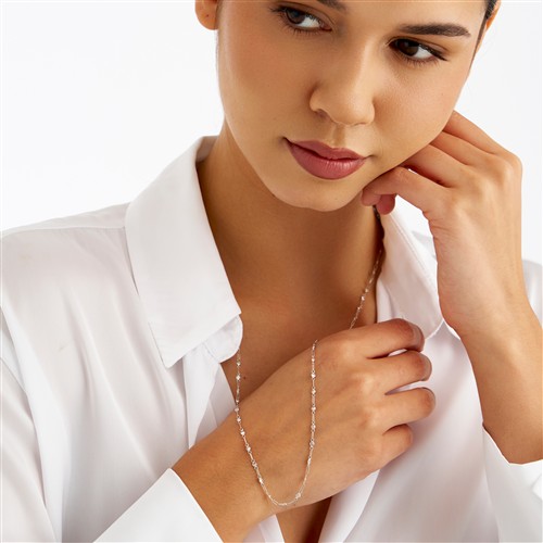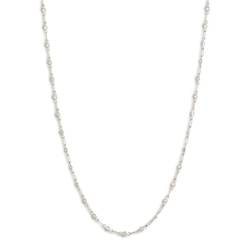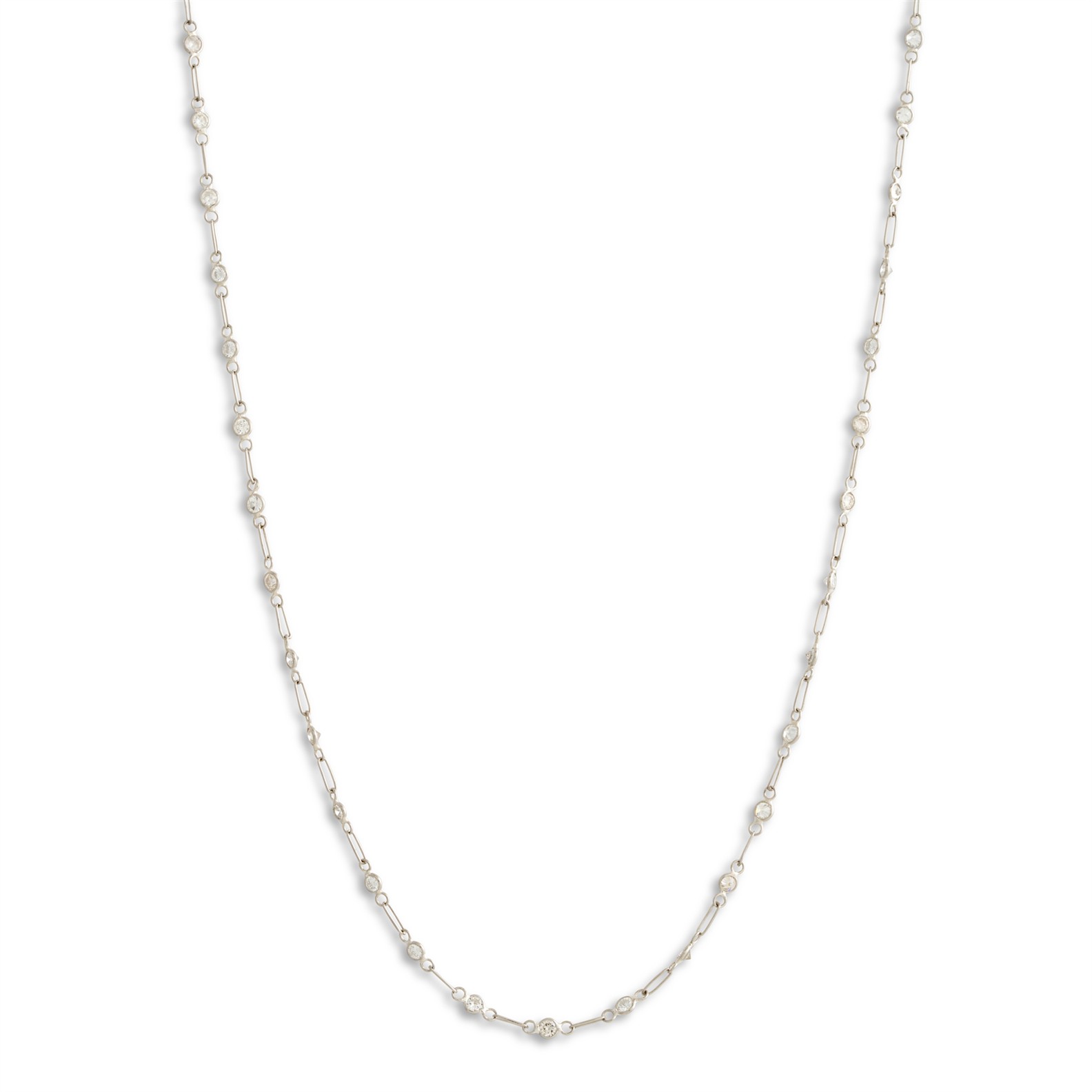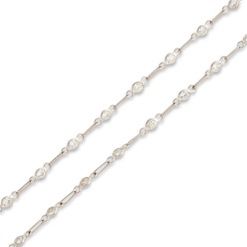 Designed as a continuous line of trace chain links, spectacle-set at intervals with brilliant-cut diamonds, the diamonds together weighing approximately 2.34 carats, mounted in platinum, inner circumference 720mm, gross weight approximately 4.6 grams.
