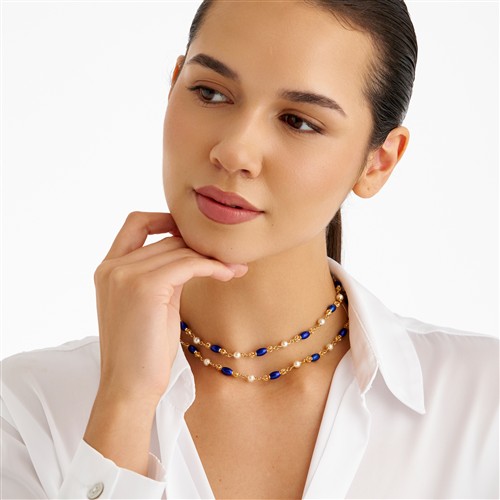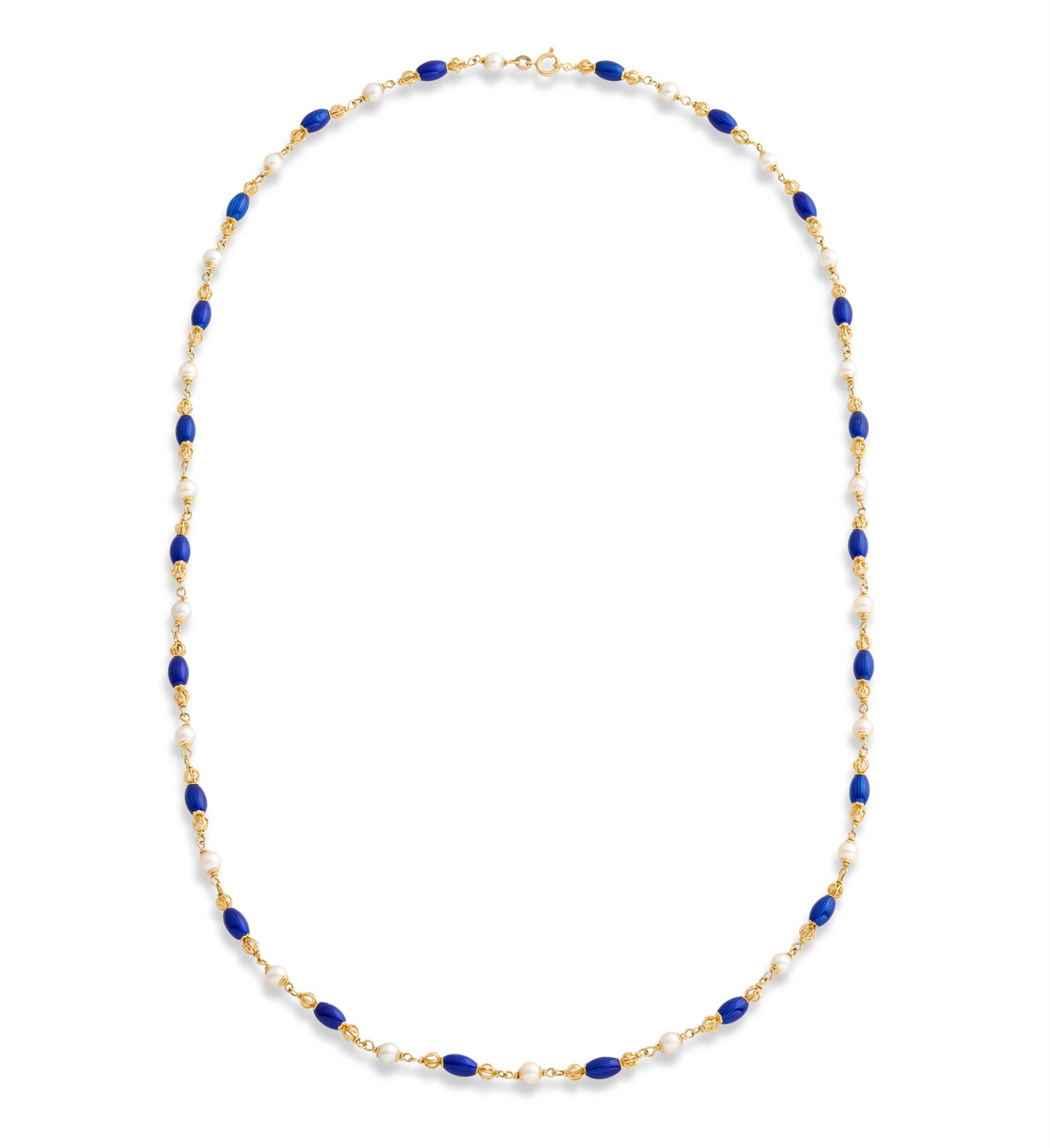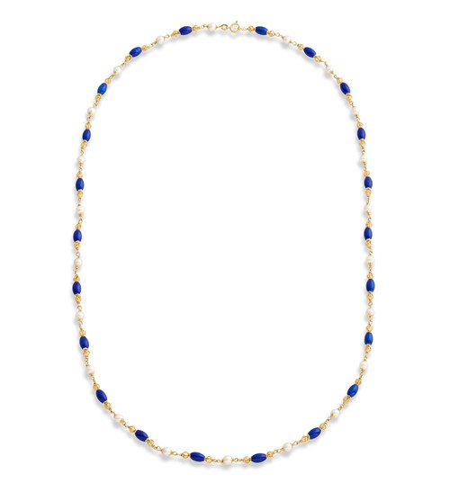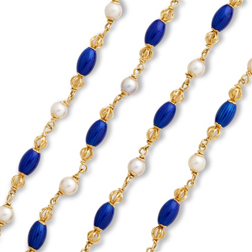 Designed as line of blue enamel ovoid and gold ball links alternated with Akoya pearl connectors, mounted in 18ct gold, inner circumference 730mm, gross weight approximately 32.8 grams, stamped Italy, signed Unoaerre.