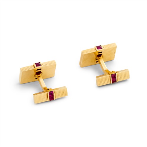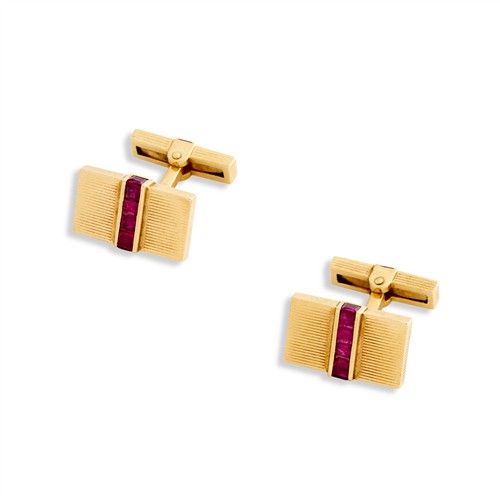 Each of rectangular fluted design, centring a line of channel-set calibre-cut rubies to similarly set toggle closure, mounted 14ct gold, length 18mm, gross weight approximately 18.8 grams, signed Tiffany & Co.