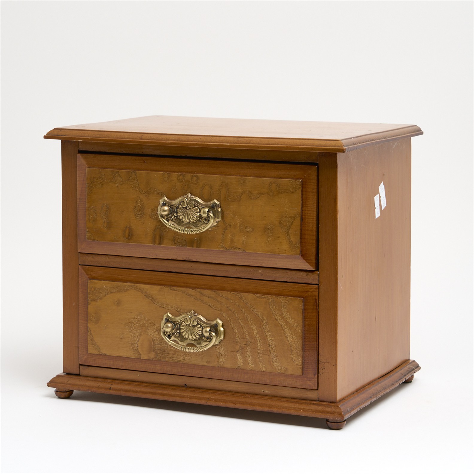 AN AUSTRALIAN PINE AND FIGURED OAK TWO DRAWER CHEST L.31CM