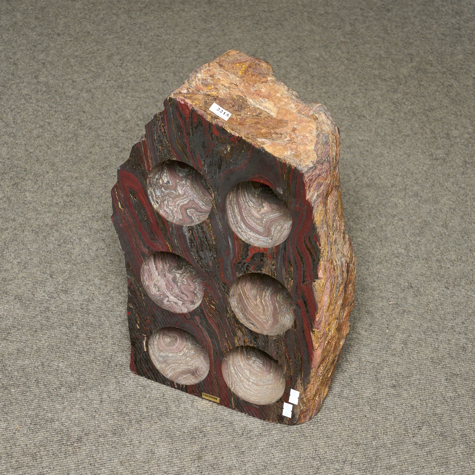 A HEAVY WESTERN AUSTRALIAN FOSSILISED TIGER IRON SIX BOTTLE WINE STORAGE HOLDER H.45CM