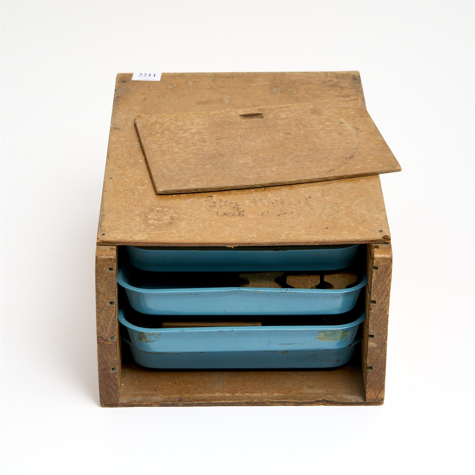 A CASED SET OF WOODEN AND RUBBER STAMPS IN FOUR PULL OUT METAL TRAYS L.31CM (CASE)