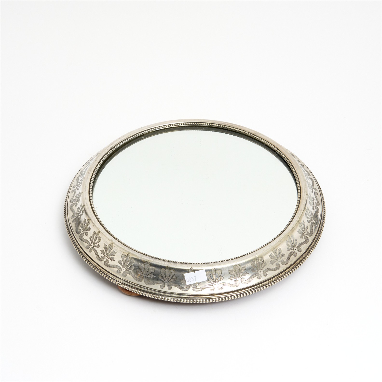 A SILVER PLATE AND WOODEN BASED MIRRORED PLATEAU DIA.29CM