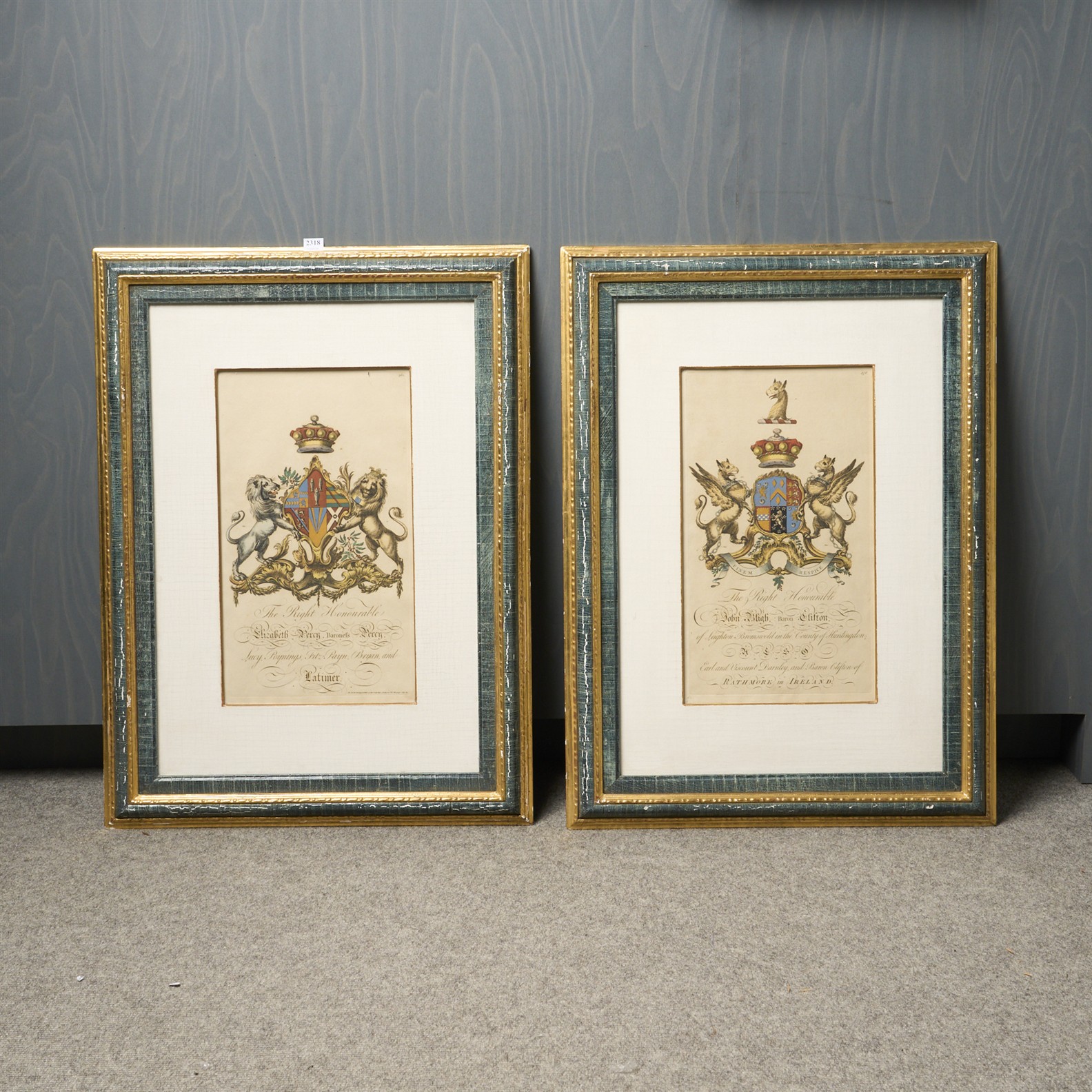 TWO FRAMED ARMORIAL CRESTS TAKEN FROM THE BARONAGIUM GENEALOGICUM, 1764, INCLUDING JOHN BLIGH, 4TH EARL OF DARNLEY, AND BARONESS ELIZABETH PERCY, BARONESS PERCY 76 X 56CM