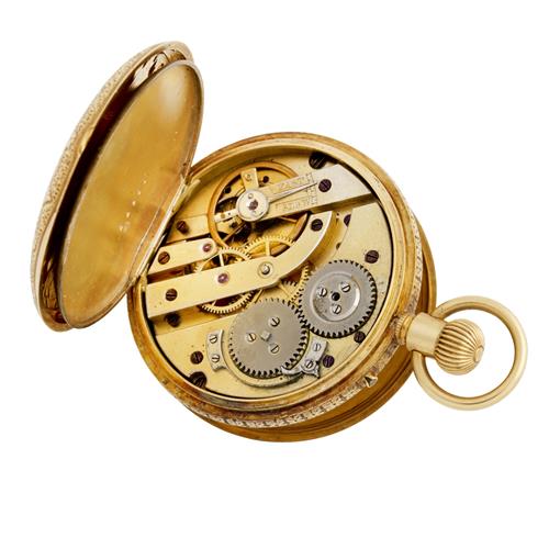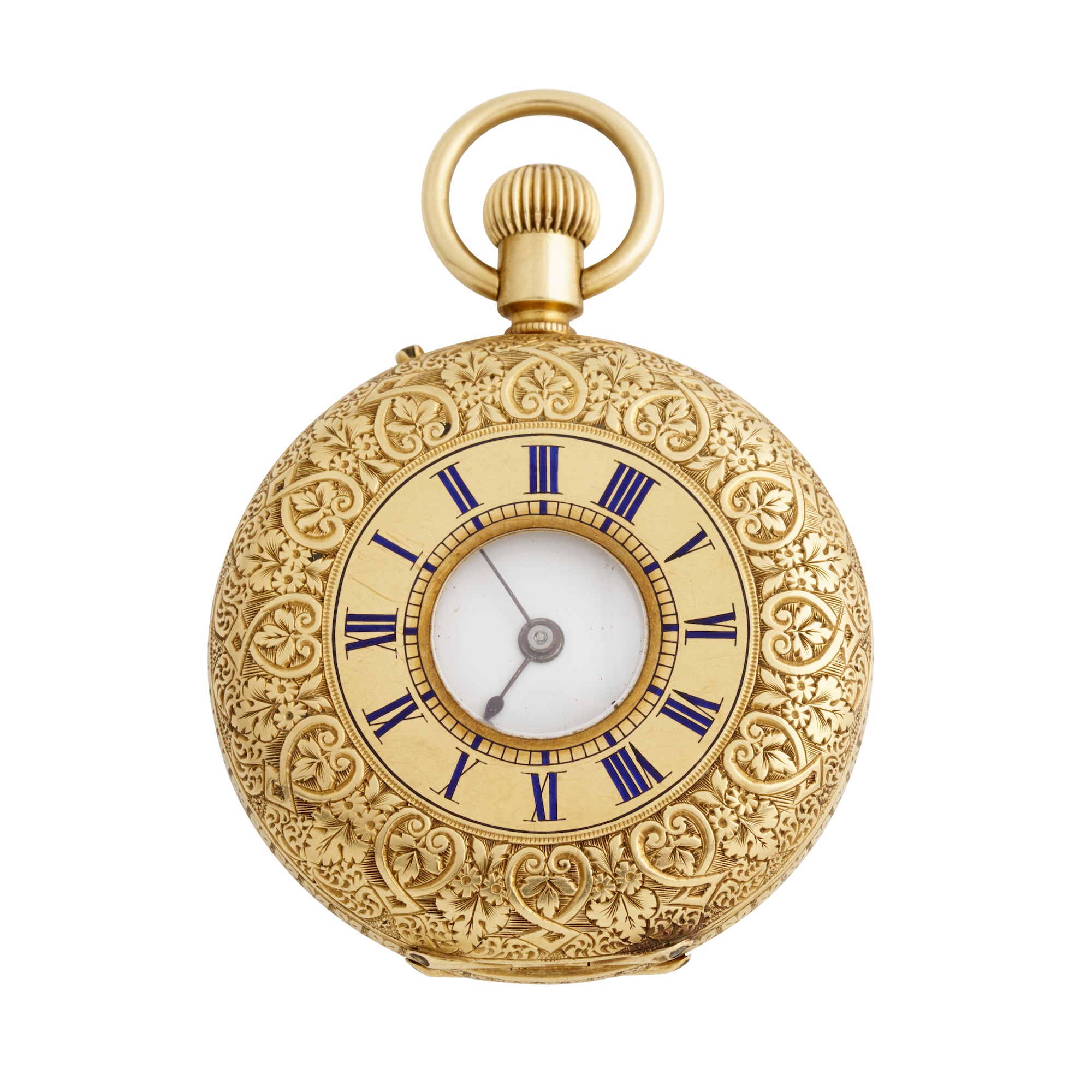 Case: foliate engraved, front cover with blue enamel Roman numerals, gilt cuvette, no. 22356