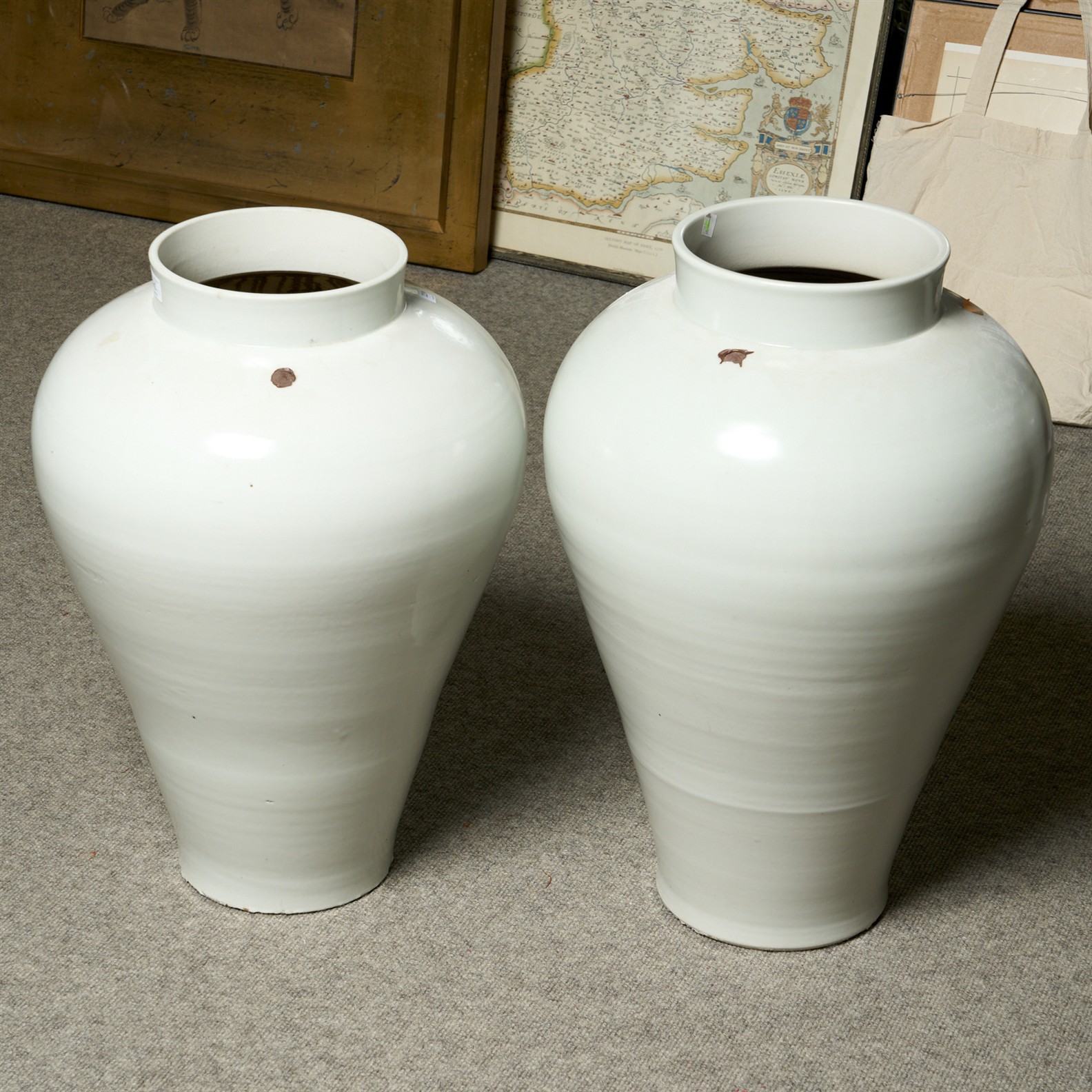 TWO CHINESE HIGH SHOULDERED WHITE GLAZED BALUSTER VASES, BOTH WITH REMNANTS OF EXPORT SEAL H.65CM (TALLEST)