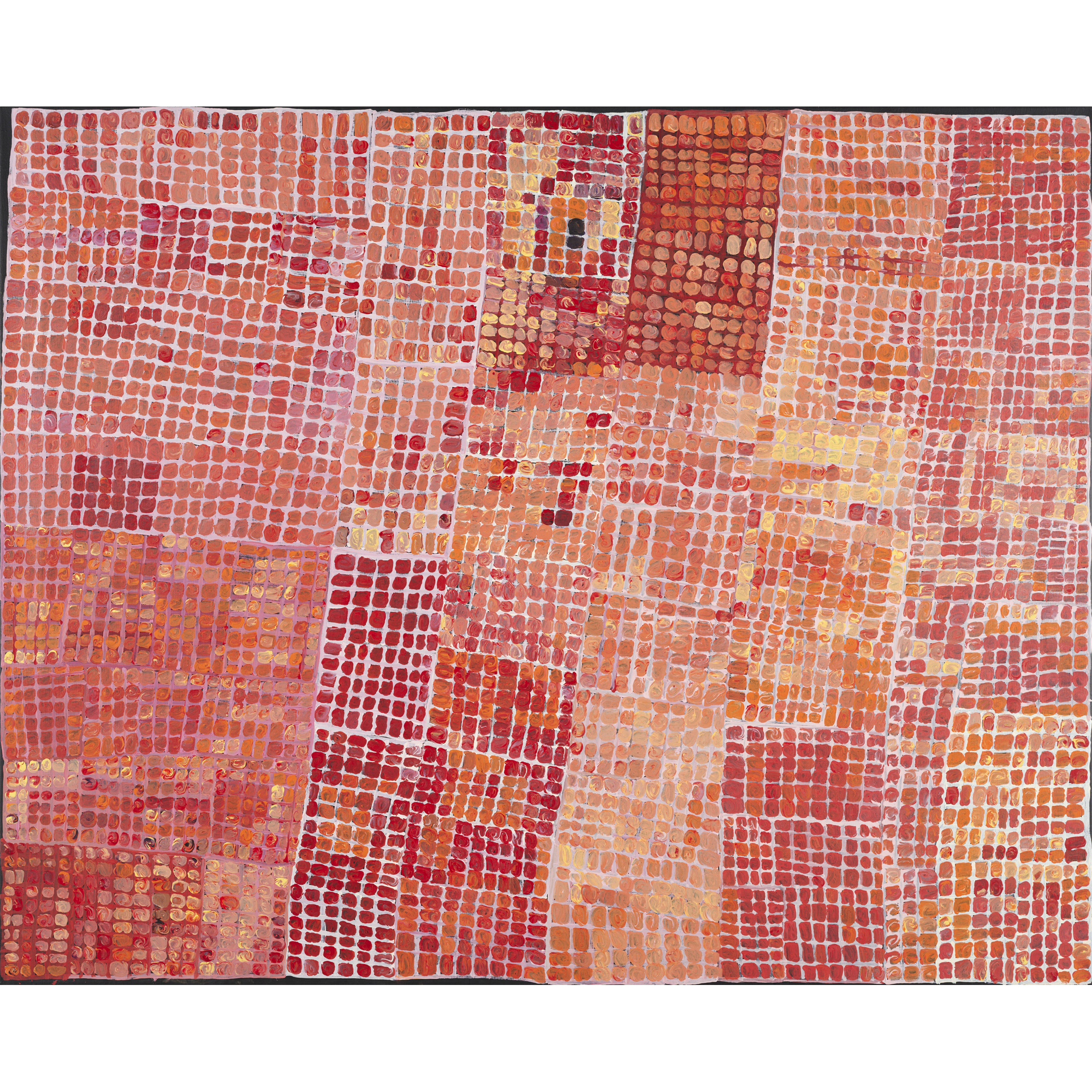 "In this work Carbiene depicts four dreaming stories which he inherited from his father. These tjukurrpa are associated with a series of waterholes running between Docker River and Kata Tjuta. Specifically, it includes four important sites: Petermann Ranges, Docker River, Kalaya Murrpu (Blood's Range) and Mulyayti near Kata Tjuta.