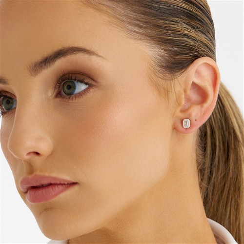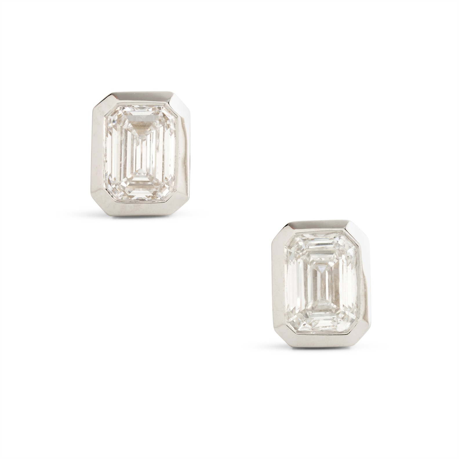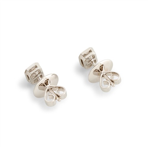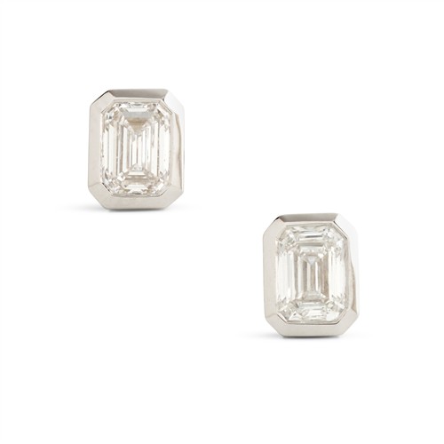 The emerald-cut diamonds each weighing 0.50 carats respectively, are collet-set, mounted in 18ct white gold, post and scroll fittings, gross weight approximately 3.1 grams.