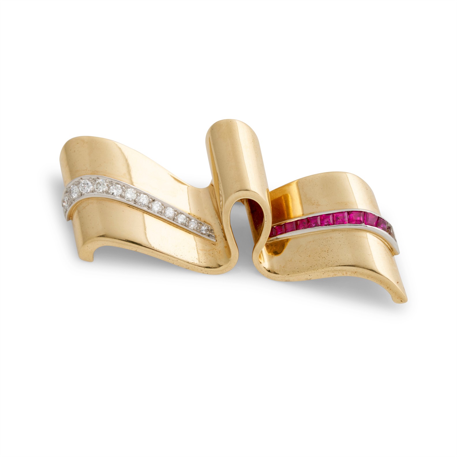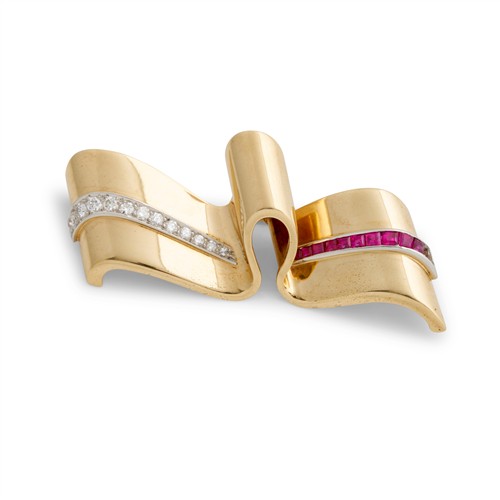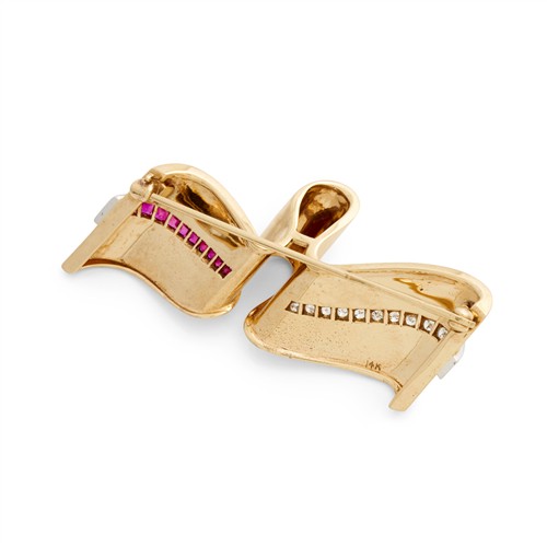 Modelled as a stylised ribbon, centring a graduating line of pavé-set brilliant-cut diamonds and channel-set calibre-cut rubies, the diamonds and rubies together weighing approximately 0.50 carats and 0.40 carats respectively, mounted in 14ct gold, length 50mm, gross weight approximately 9.7 grams, signed Tiffany & Co.