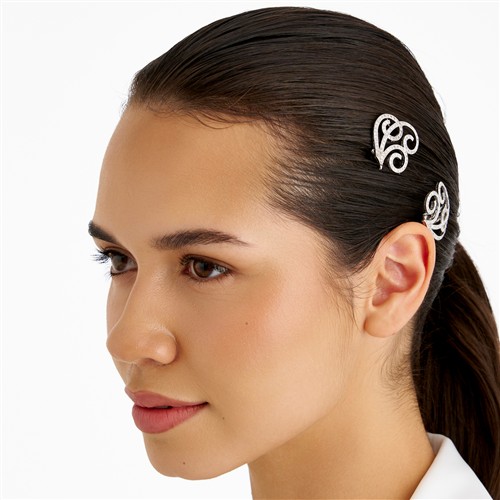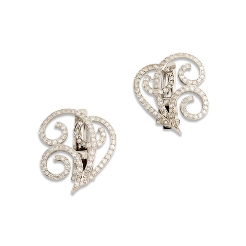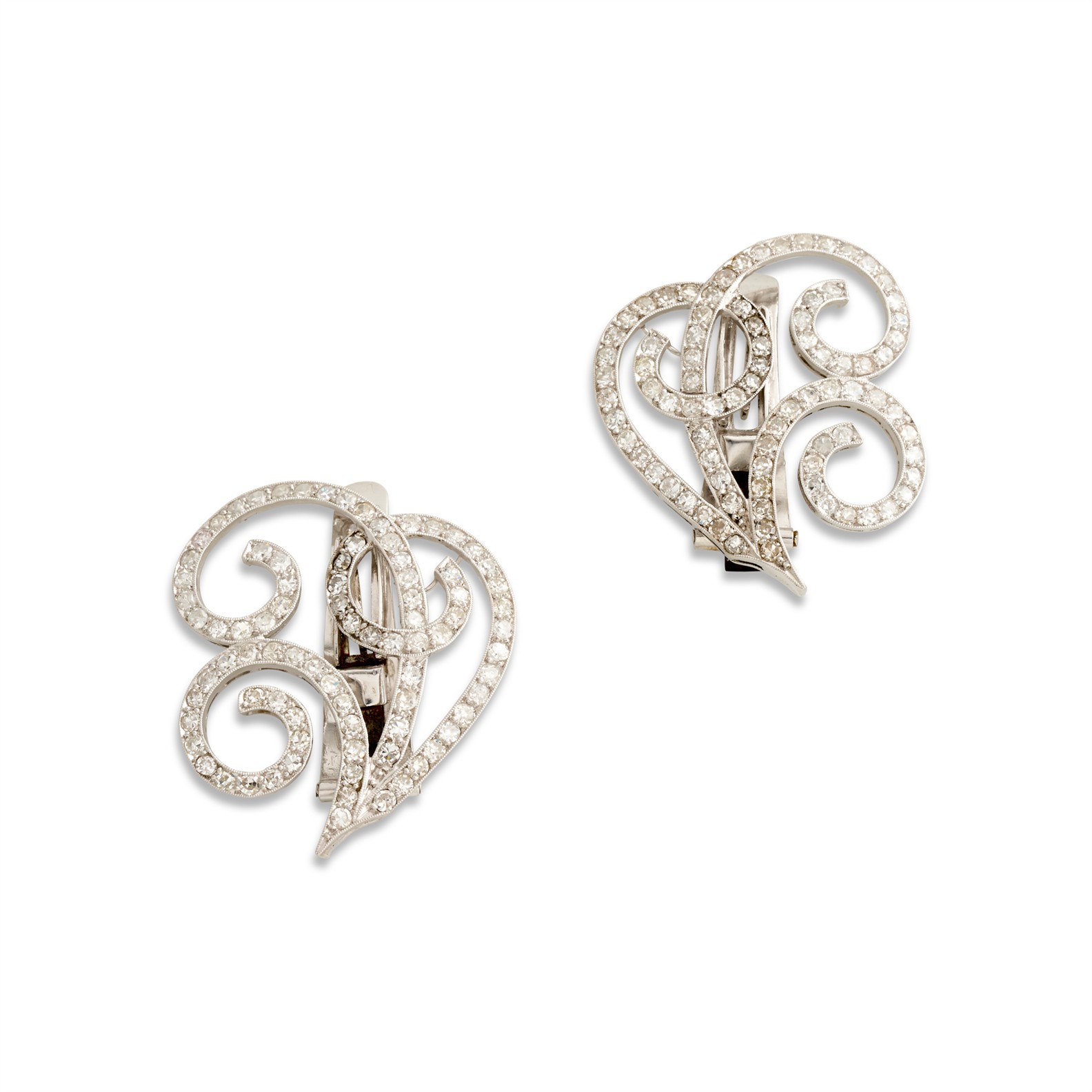 Each of openwork arabesque design, pavé-set with single and early brilliant-cut diamonds, the diamonds together weighing approximately 3.00 carats, mounted in platinum, length 33mm, gross weight approximately 15.3 grams.