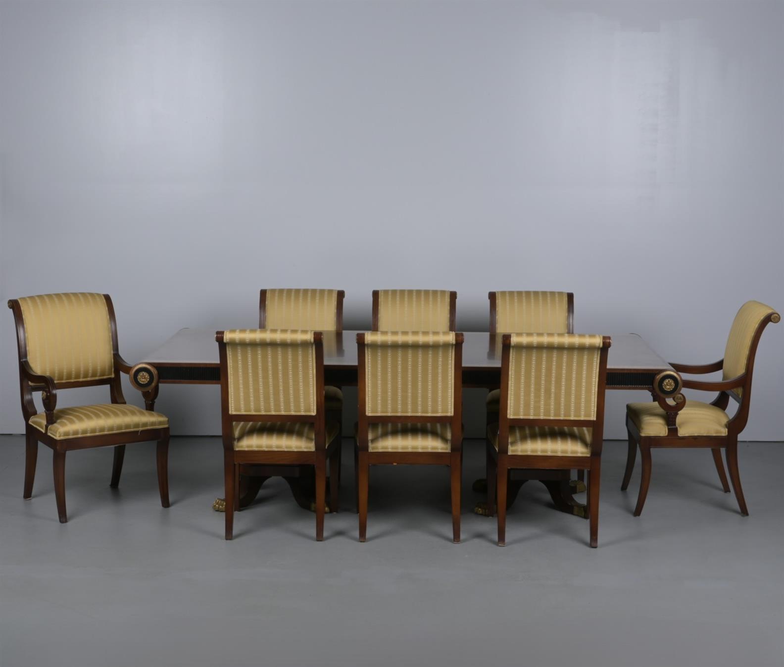 A DINING SUITE IN CONTEMPORARY NEO-CLASSICAL MANNER, COMPRISING A TWO-PEDESTAL TABLE AND EIGHT CHAIRS, INCLUDING TWO ELBOW CHAIRS (AF)