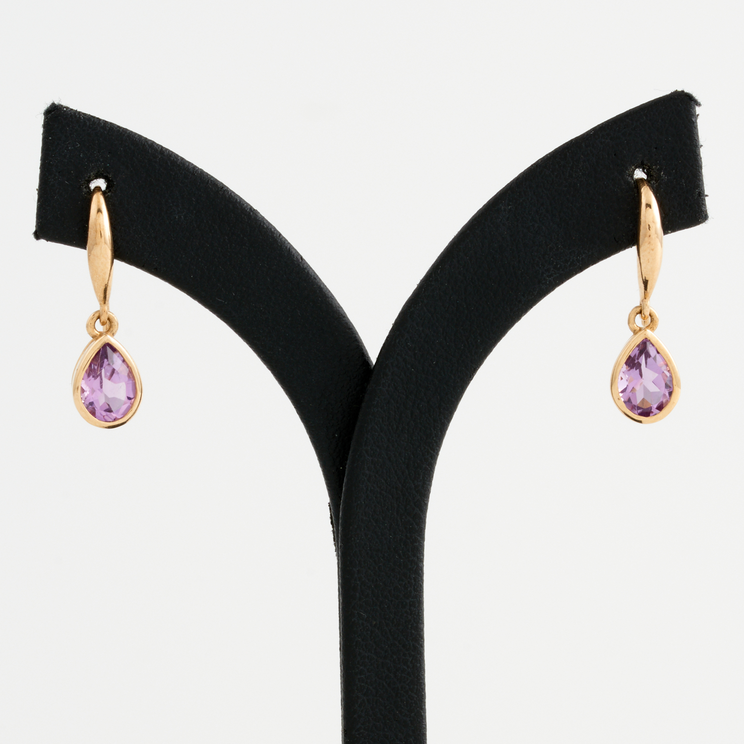 A PAIR OF AMETHYST EARRINGS IN 9CT GOLD TO SHEPHERD HOOK FITTINGS, LENGTH 21MM, TOTAL WEIGHT 1.50GMS