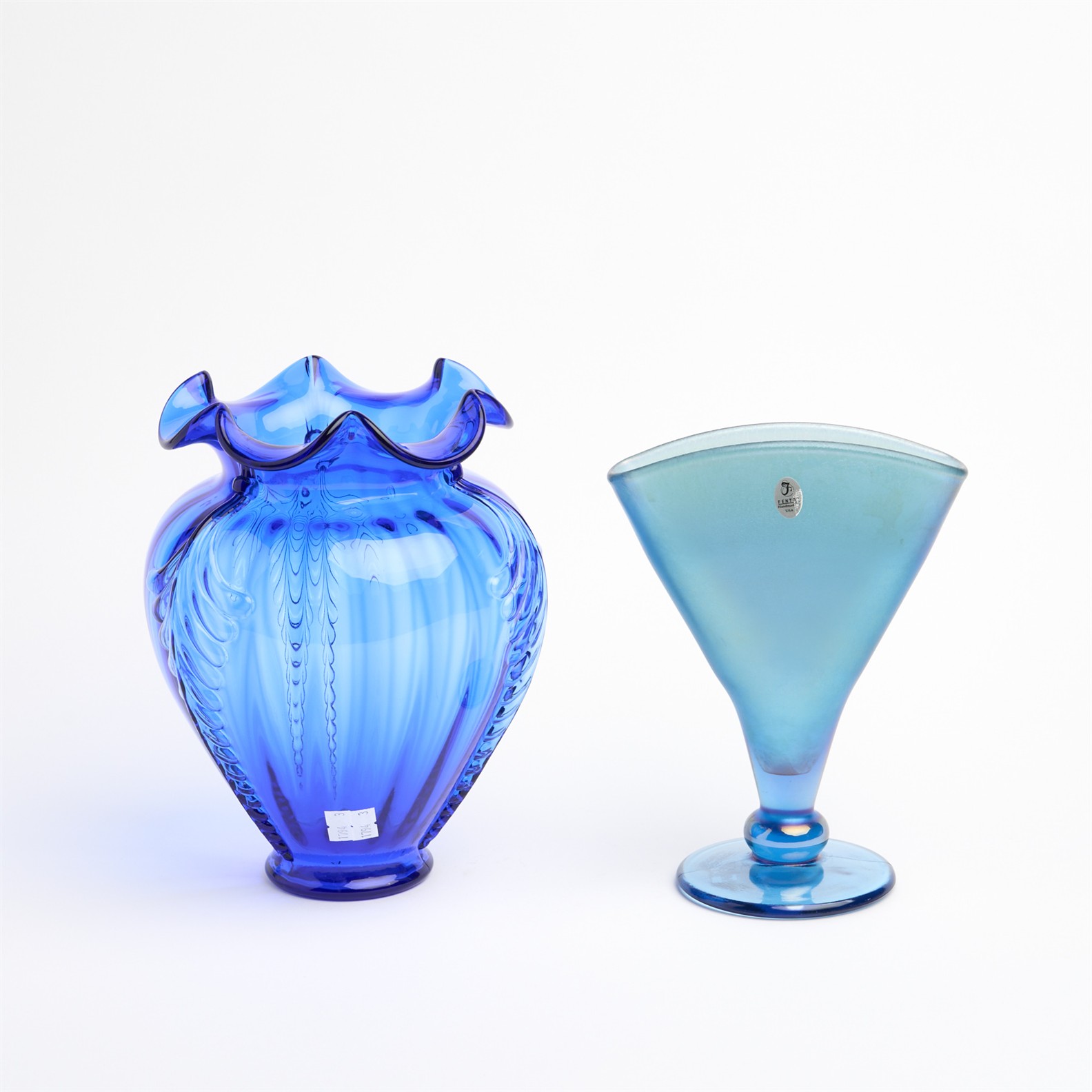 A FENTON COBALT BLUE FEATHERED BELLY GLASS VASE AND A FENTON IRIDESCENT BLUE FAN VASE H.24 CM (TALLEST)