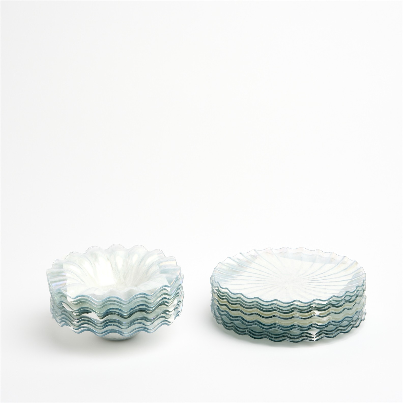 TWELVE IRIDESCENT GLASS LIMITED PRODUCTION PLATES AND ELEVEN BOWLS EACH SIGNED BY MESOLINI GLASS STUDIO SEATTLE 1987 DIA.21CM (LARGEST)