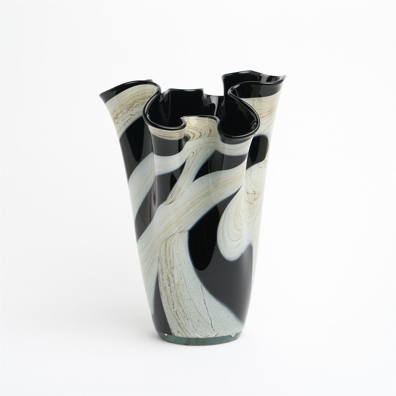 A LARGE BLACK, WHITE AND BROWN ITALIAN ART GLASS FAZZOLETTO VASE H.34CM