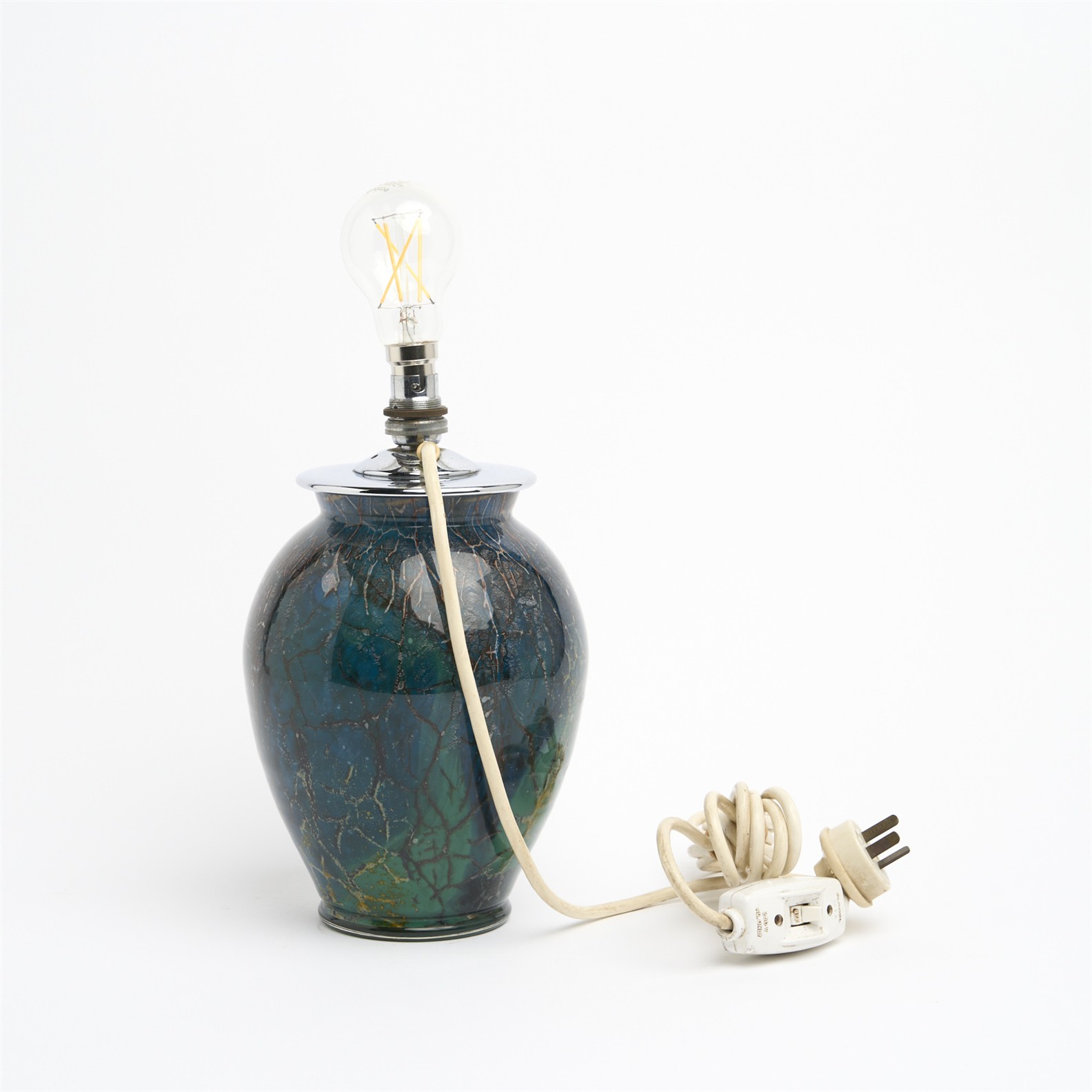 A 1920'S GERMAN WMF IKORA HAND-BLOWN GLASS TABLE LAMP WITH INTERNAL GLOBE BY KARL WIEDMANN H.28CM