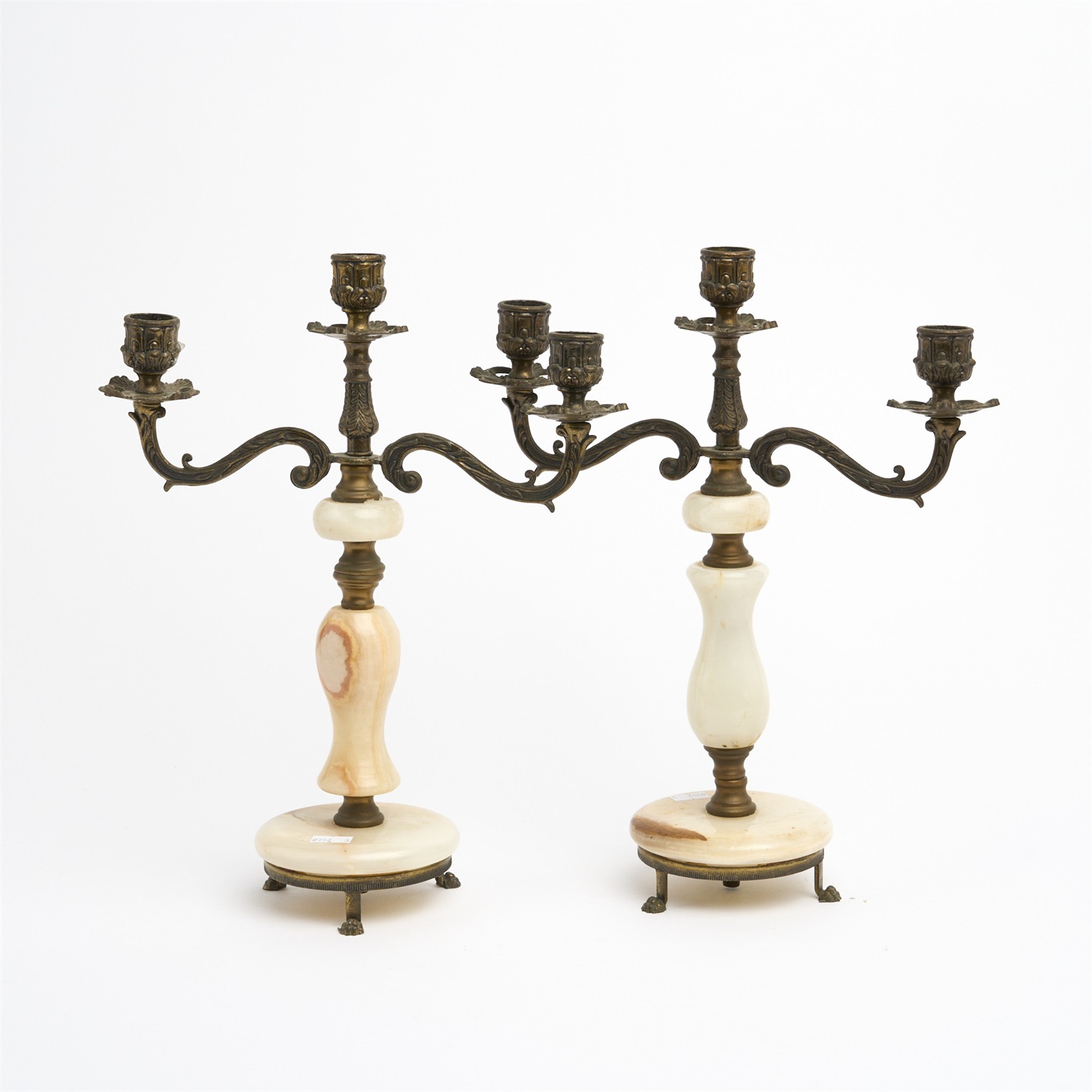 A PAIR OF AGATE BASE BRASS CANDELABRA H.36CM