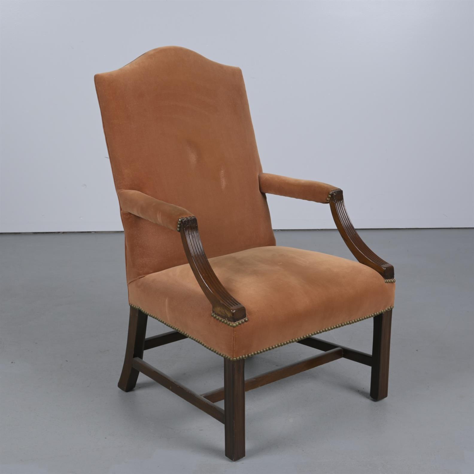 A GEORGE III-STYLE MAHOGANY 'GAINSBOROUGH' LIBRARY ARMCHAIR (112CM H X 65CM W X 79CM D)