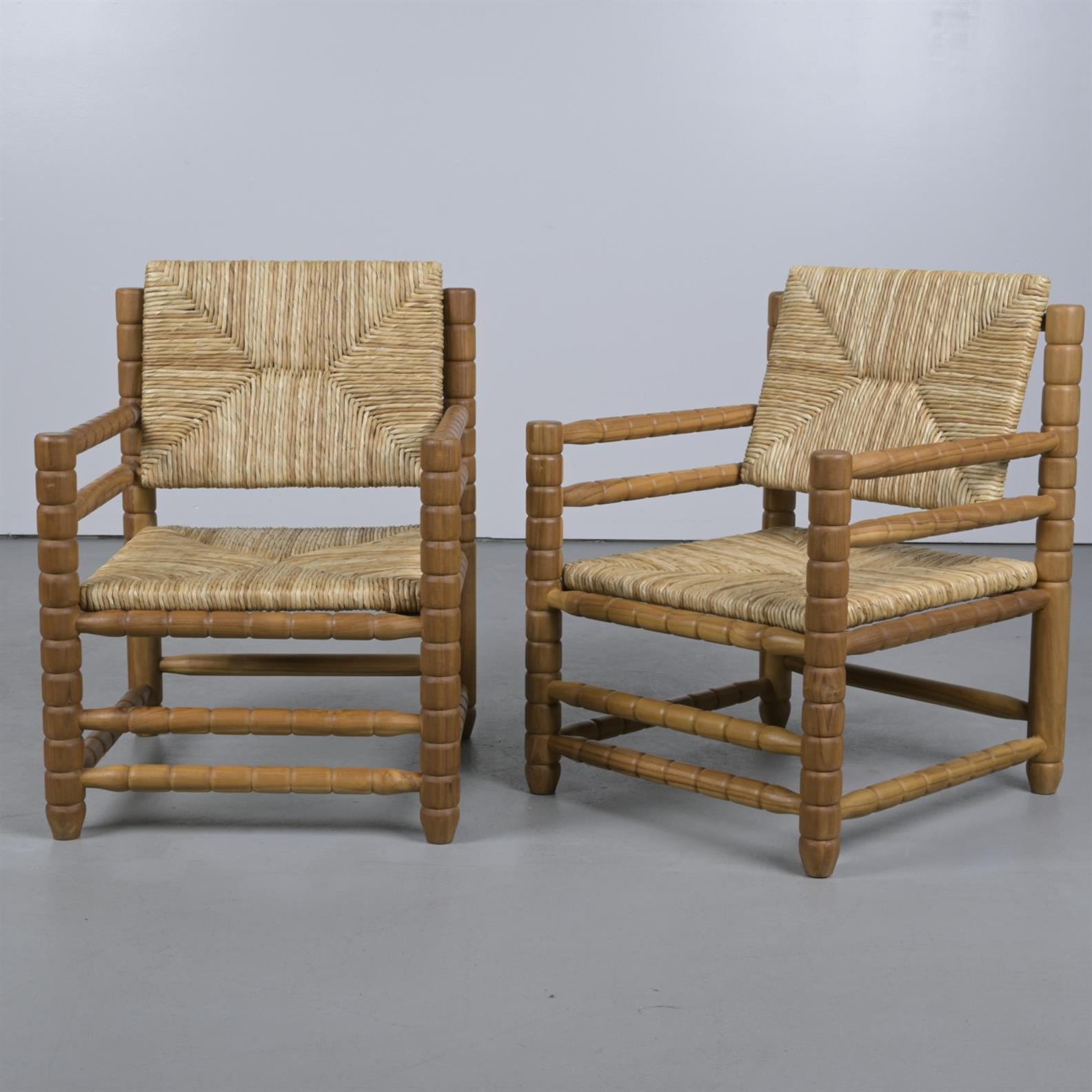A PAIR OF TEAK AND RUSH ARMCHAIRS (85CM H X 63CM W X 67CM D)