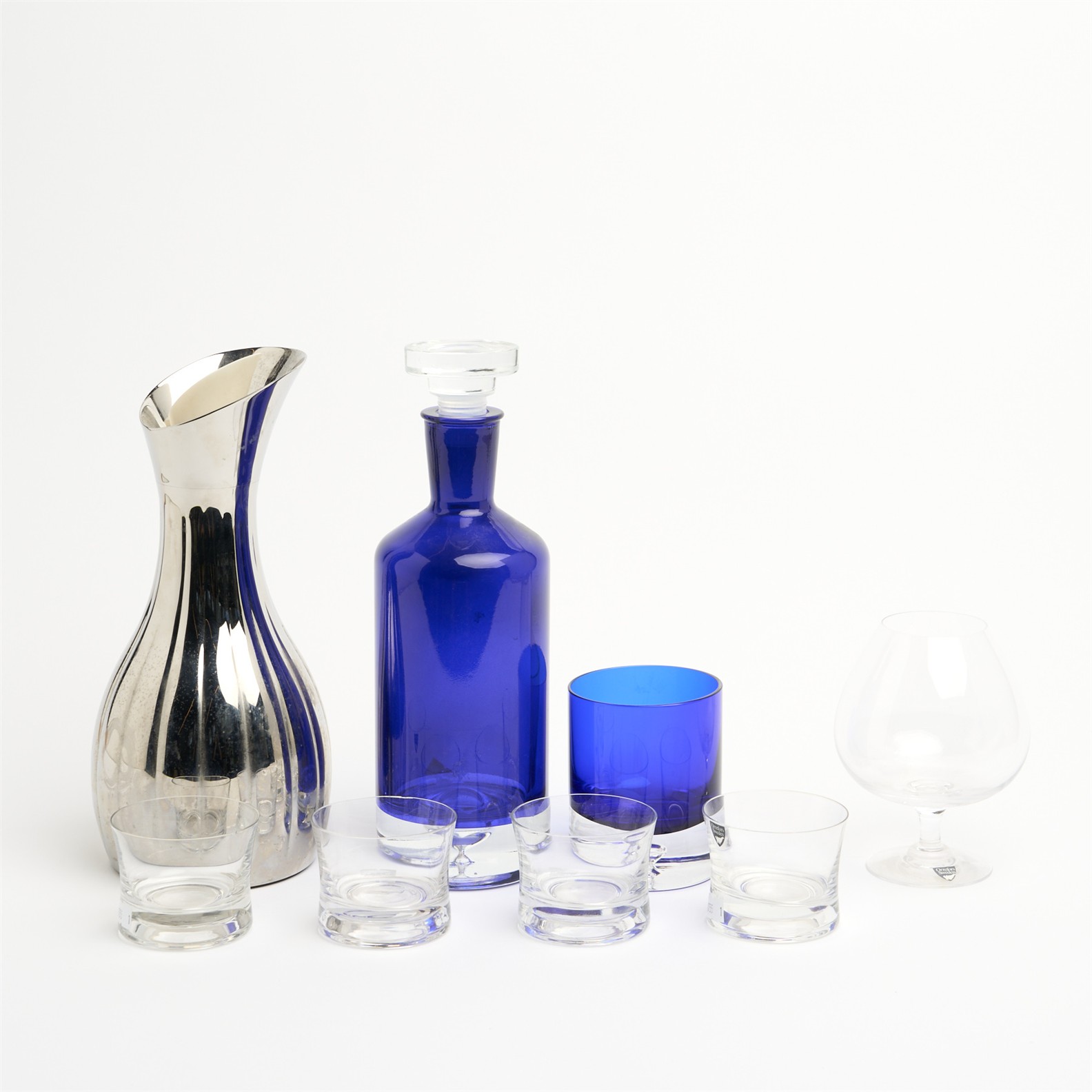 A GEORG JENSEN WATER JUG TOGETHER WITH FIVE ORREFORS GLASSES, A BLUE GLASS DECANTER AND CUP (A/F) H.29CM