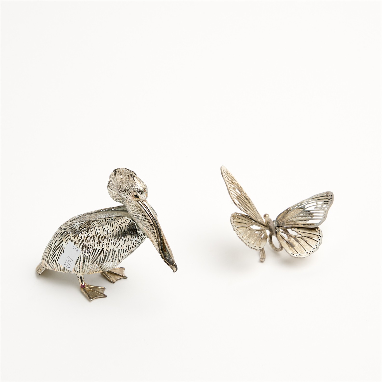 TWO CHRISTOFLE SILVERPLATE FIGURES INCLUDING A PELICAN AND A BUTTERFLY H.13CM (TALLEST)