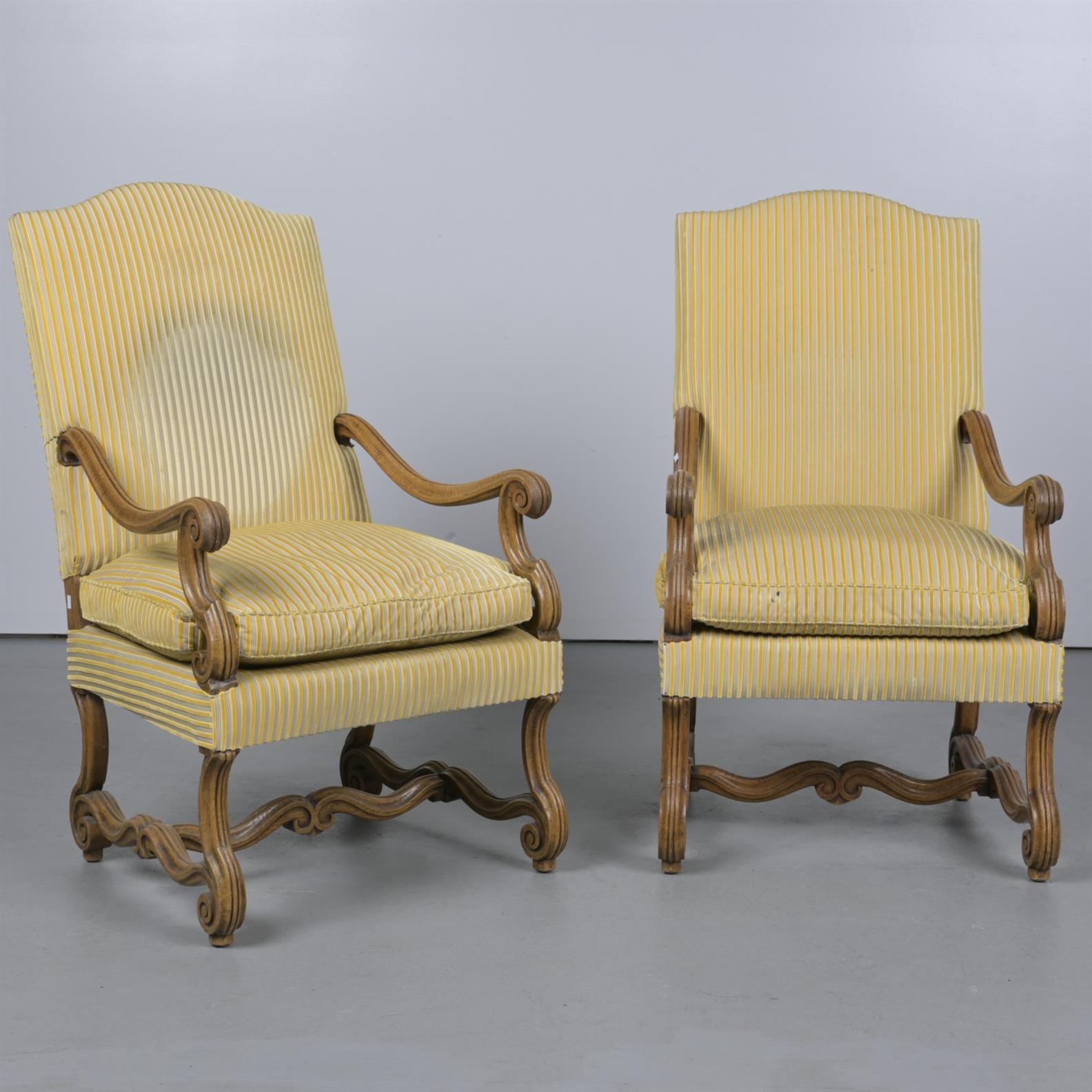 A PAIR OF LOUIS XIV-STYLE OAK AND VELVET UPHOLSTERED FAUTEUILS (A/F) (110CM H X 56CM W X 80CM D)