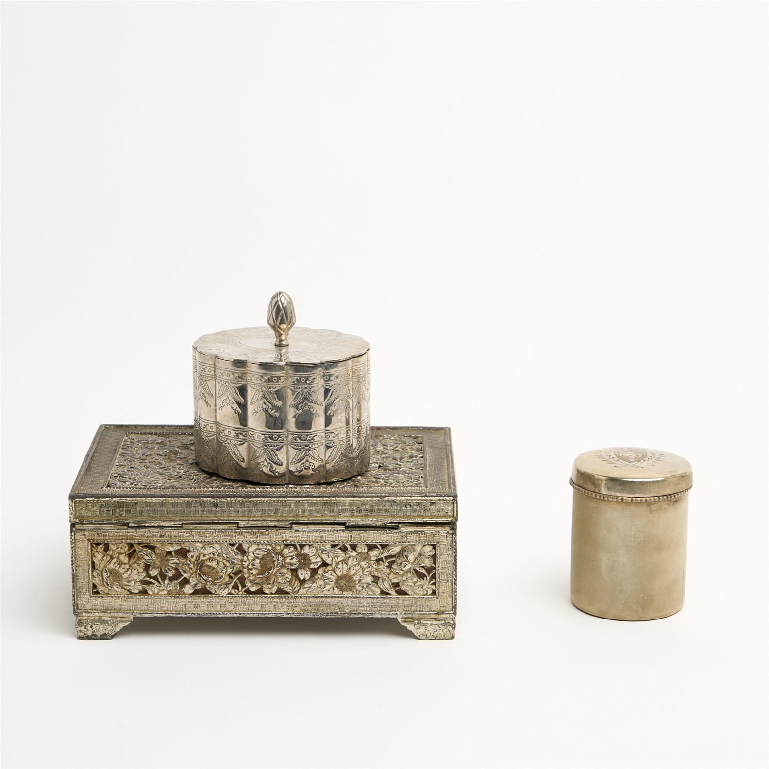TWO DECORATIVE SILVER PLATE BOXES WITH A SILVER PLATE CANNISTER W.23.5CM (WIDEST)