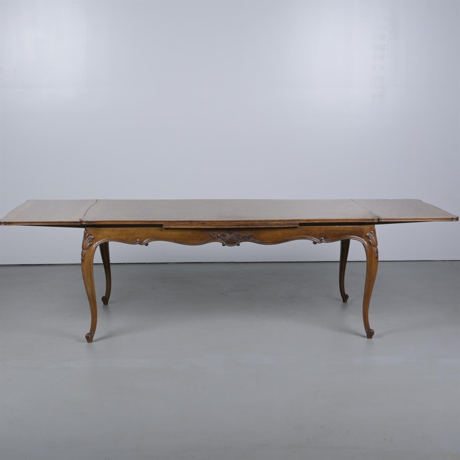 AN OAK DRAW-LEAF EXTENDING DINING IN PROVINCIAL LOUIS XV MANNER, WITH A PARQUETRY TOP (75CM H X 275 CM W X 100CM D, EXTENDED)