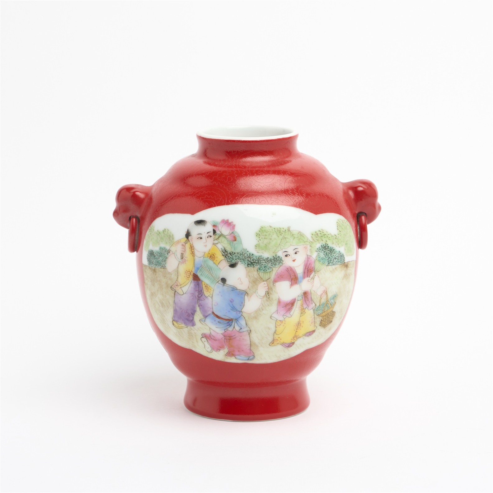A CHINESE REPUBLIC PERIOD RED GROUND VASE WITH PAINTED RESERVES OF CHILDREN H.18.5CM