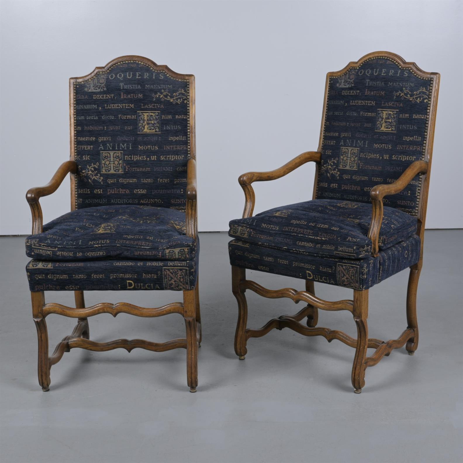 A PAIR OF SIX PROVINCIAL REGENCE-STYLE OAK AND UPHOLSTERED DINING FAUTEUILS (128CM H X 62CM W X 67CM D)