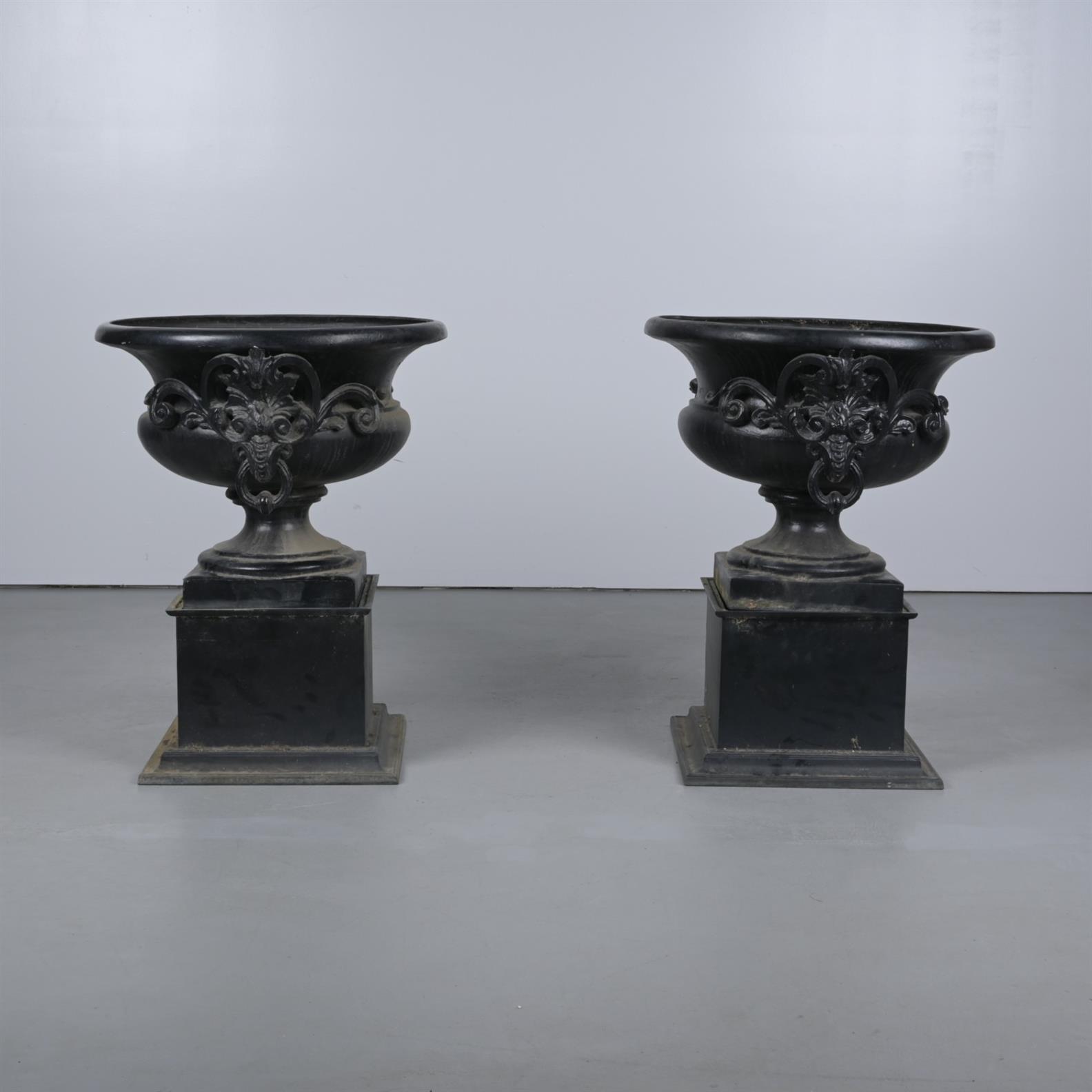 A PAIR OF LARGE VICTORIAN-STYLE CAST IRON GARDEN VASES ON PEDESTALS (A/F) (100CM H X 88CM DIA)