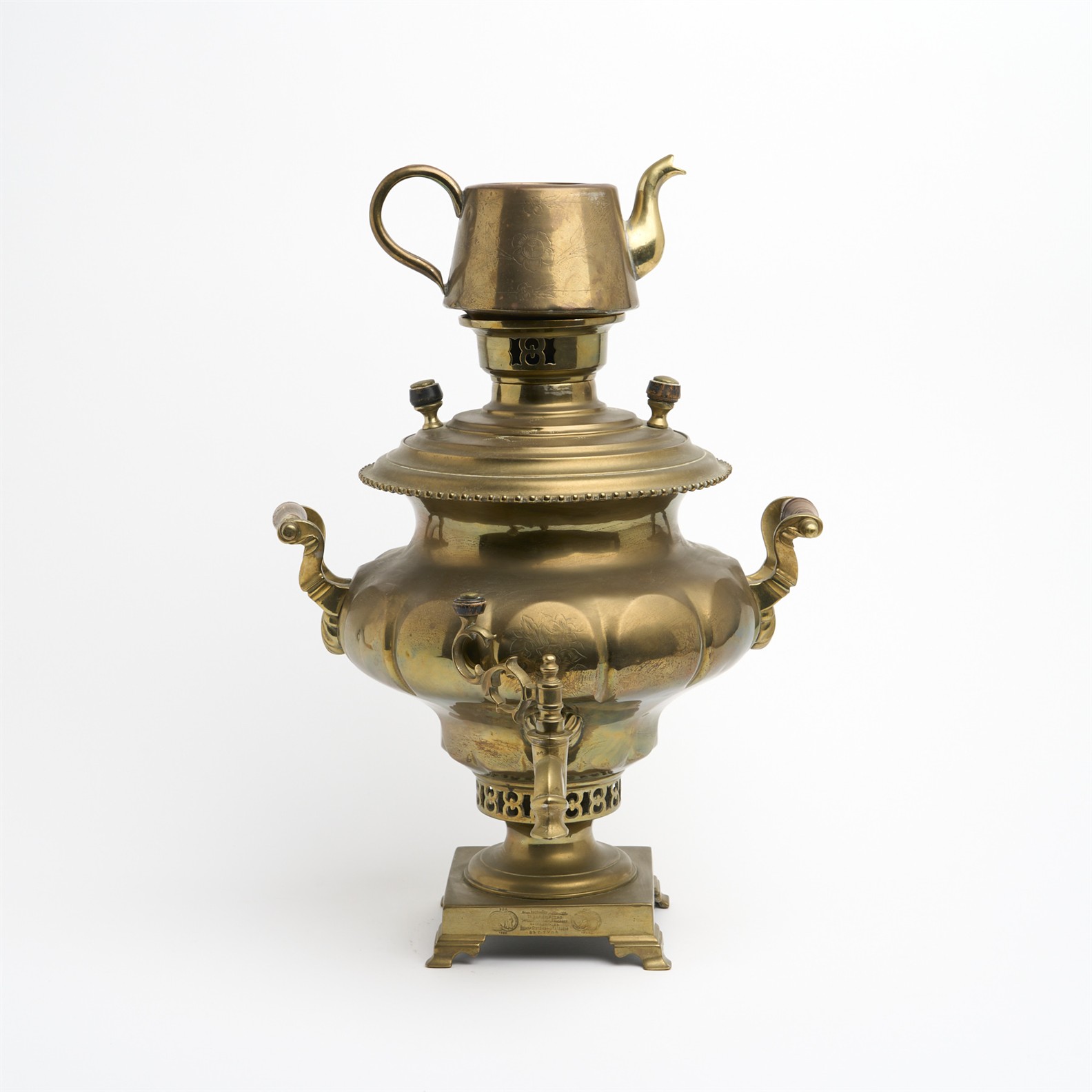 AN ANTIQUE COPPER SAMOVAR WITH MATCHED WATER POT, BEARING A RUSSIAN STAMP DATED 1885