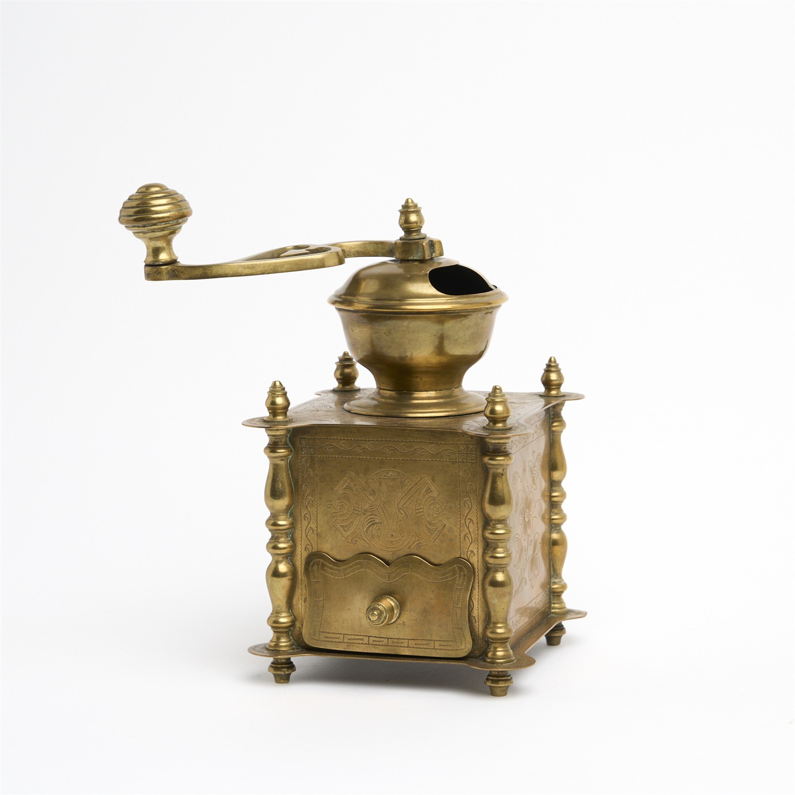 A DECORATIVE ANTIQUE BRASS COFFEE GRINDER H.24CM