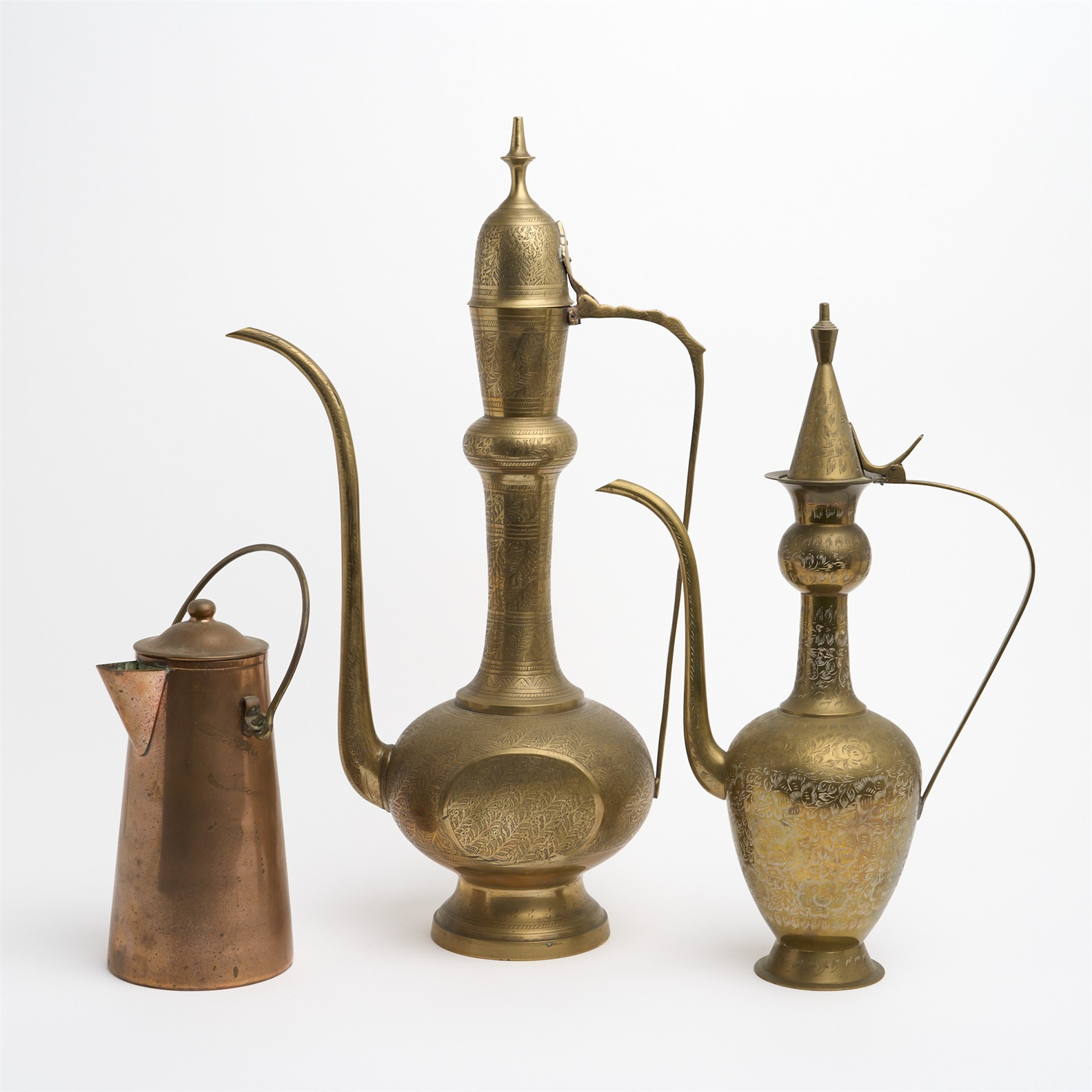 TWO SIRIAN BRASS POURERS TOGETHER WITH A SMALLER COPPER HOT WATER POT H.60CM (TALLEST)