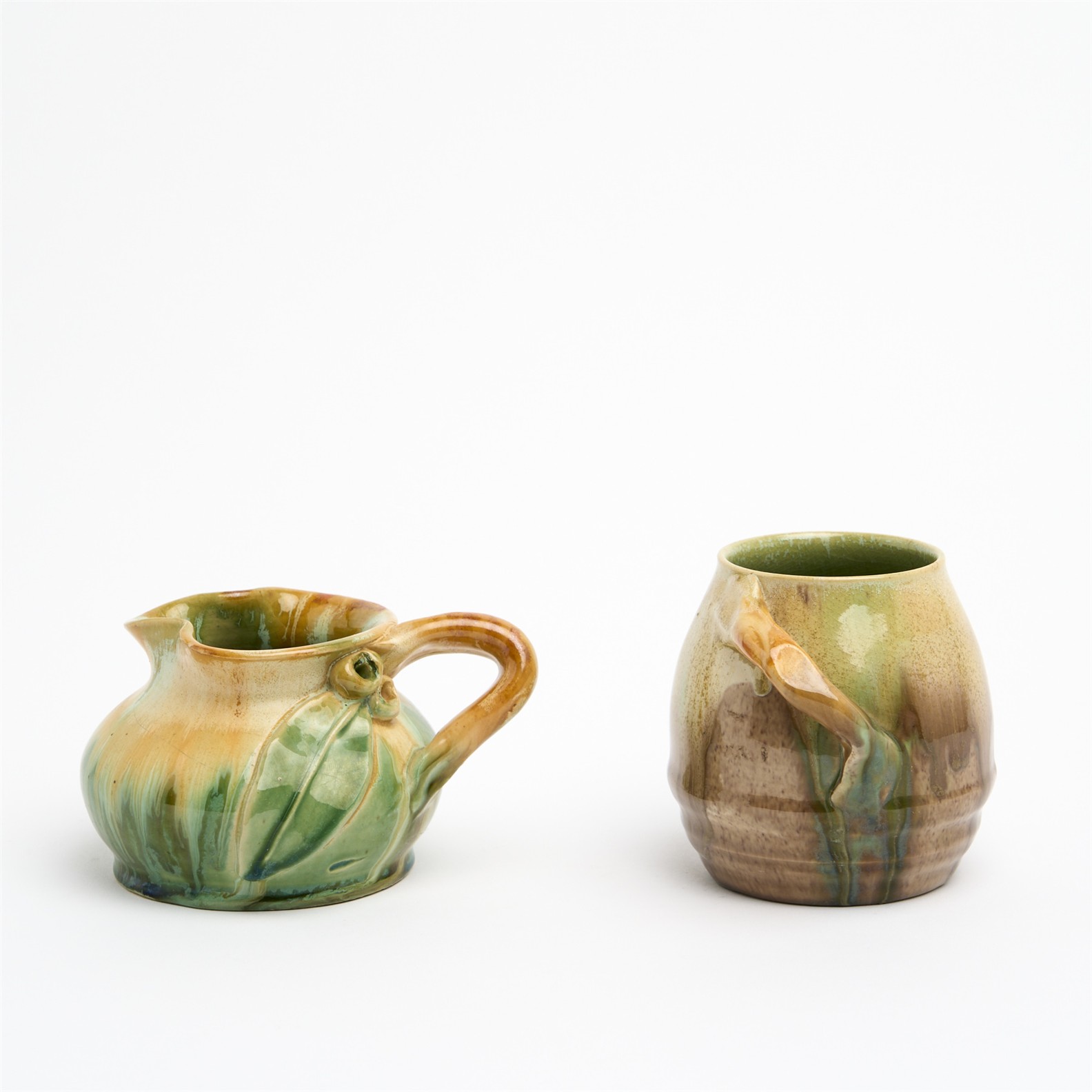 TWO PIECES OF REMUED POTTERY INCLUDING A JUG WITH APPLIED GUM LEAF AND GUM NUT (HAIRLINE TO ONE) H.10CM (TALLEST)
