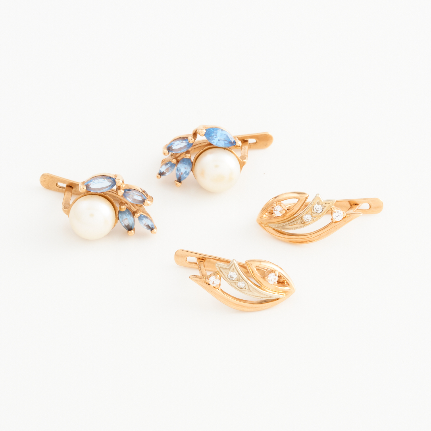 TWO PAIRS OF EARRINGS IN 14CT GOLD TO POST AND CLIP FITTINGS WITH PEARL AND GEM DETAILS, TOTAL COMBINED WEIGHT 8.3GMS