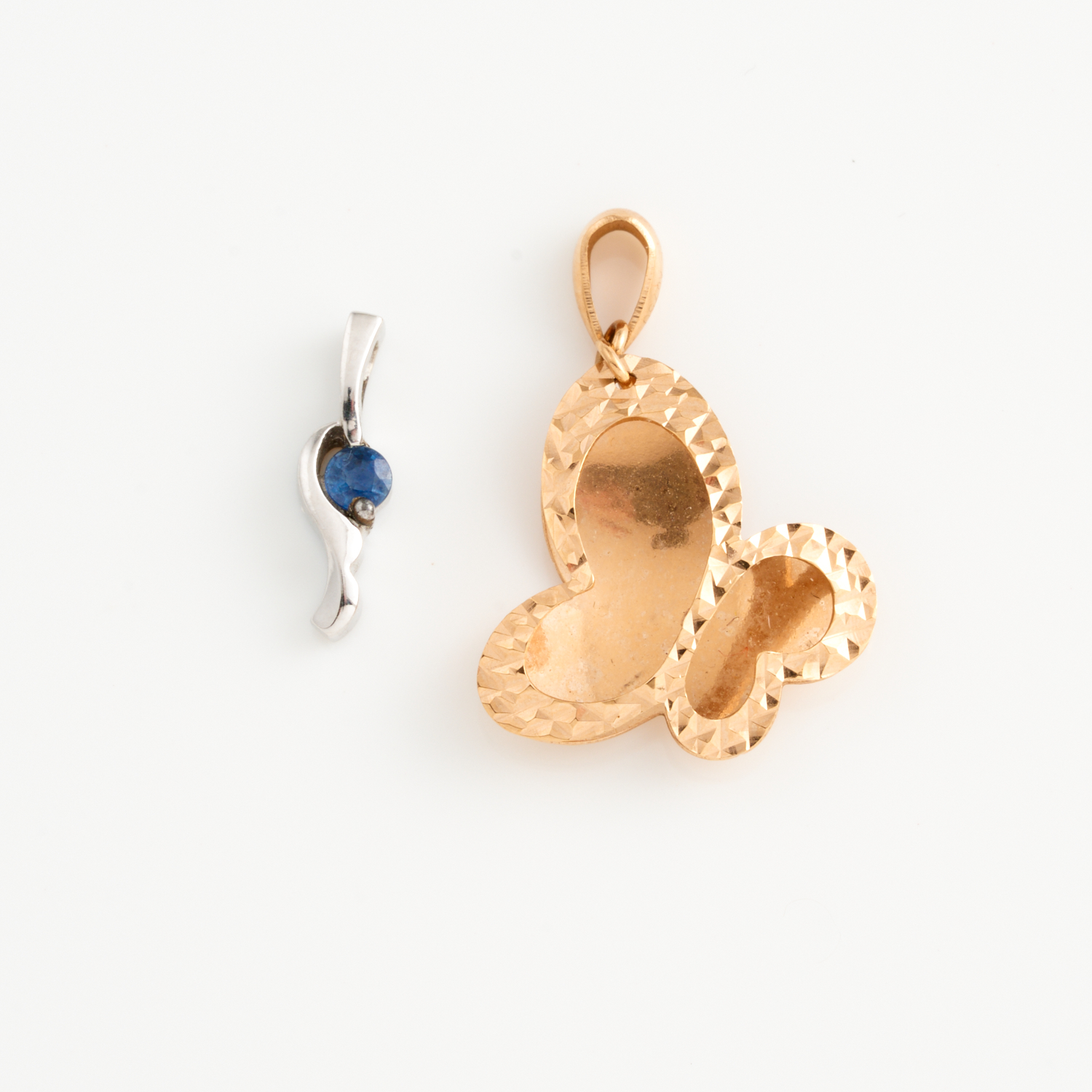 A PENDANT IN 18CT GOLD, TOGETHER WITH A SAPPHIRE PENDANT IN PLATINUM, THE LARGEST MEASURING 20MM, TOTAL WEIGHT 1.5GMS