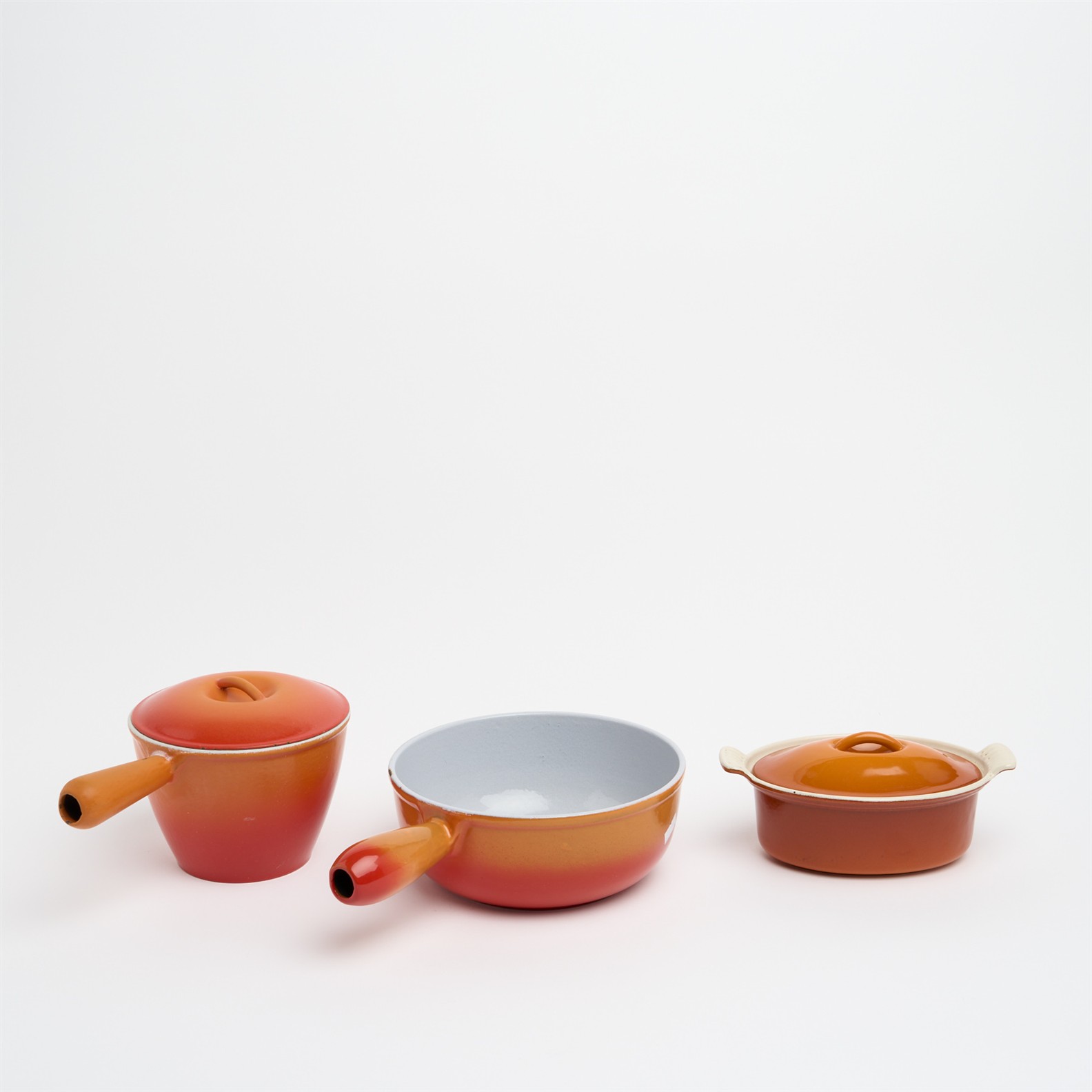 THREE PIECES OF FRENCH CAST IRON ENAMEL COOKWARE INCLUDING LE CREUSET AND COUSANCES L.32CM (LONGEST)